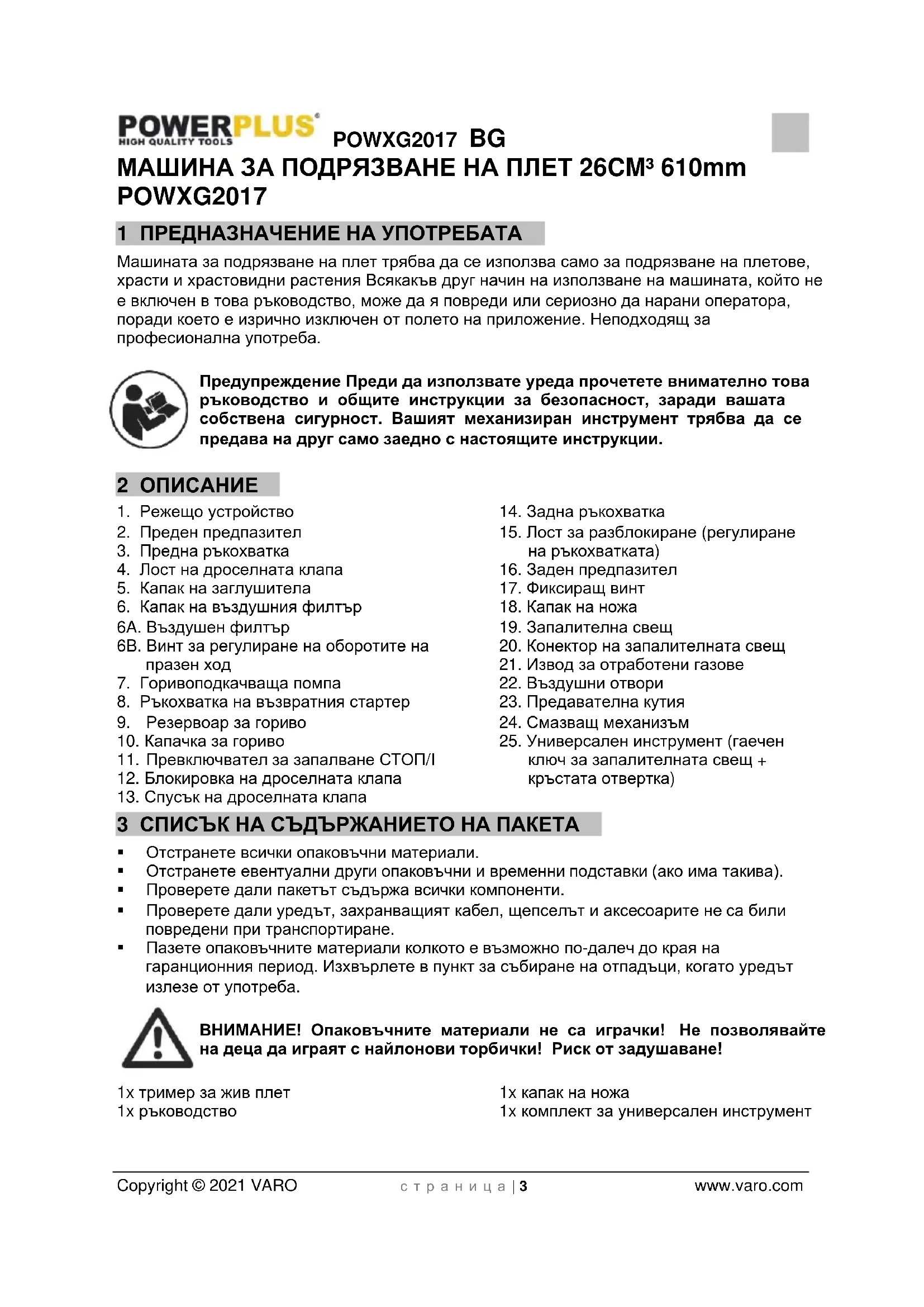 - 18 ДЕКЛАРАЦИЯ ЗА СЪОТВЕТСТВИЕ POWXG2017 BG Copyright © 2021 VARO с т р а н и ц а | 3 www.varo.com МАШИНА ЗА ПОДРЯЗВАНЕ НА ПЛЕТ 26CM³ 610mm POWXG2017 1 ПРЕДНАЗНАЧЕНИЕ НА УПОТРЕБАТА Машината за подрязване на плет трябва да се използва само за подрязване на плетове, храсти и храстовидни растения Всякакъв друг начин на използване на машината, който не е включен в това ръководство, може да я повреди или сериозно да нарани оператора, поради което е изрично изключен от полето на приложение. Неподходящ за професионална употреба. Предупреждение Преди да използвате уреда прочетете внимателно това ръководство и общите инструкции за безопасност, заради вашата собствена сигурност. Вашият механизиран инструмент трябва да се предава на друг само заедно с настоящите инструкции. 2 ОПИСАНИЕ p. 18