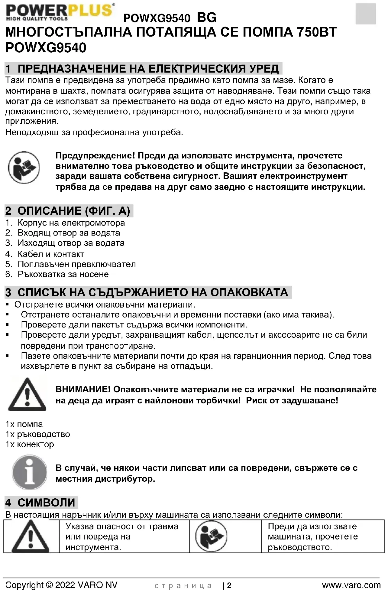 - Трябва да върнете недемонтирания инструмент на продавача в приемливо чисто състояние, в оригиналното му лято куфарче, ако устройството има такова, придружавано от доказателството за покупката. 18 ОКОЛНА СРЕДА Когато уредът ви трябва да бъде заменен след продължителна употреба, не го изхвърляйте с домакинските отпадъци, а по начин съобразен с опазването на околната среда. Отпадъците от електрически продукти не трябва да бъдат изхвърляни заедно с домакинските отпадъци. Моля, проучете къде има възможности за рециклиране. Поискайте от местните власти или от продавача съвети относно рециклирането.POWXG9540 BG Copyright © 2022 VARO NV с т р а н и ц а | 8 www.varo.com 19 ДЕКЛАРАЦИЯ ЗА СЪОТВЕТСТВИЕ VARO N.V. – Vic. Van Rompuy N.V Joseph Van Instraat 9 – BE2500 Lier – Белгия декларират, че Продукт: Многостъпална потапяща се помпа 750 Вт Марка: POWERplus Mодел: POWXG9540 е в съответствие с основните изисквания и други съответни разпоредби на приложимите Европейски директиви, базирани върху прилагането на Европейските хармонизирани стандарти. Всяка неупълномощена модификация на апарата анулира тази декларация. Европейски директиви (включително техните промени към датата на подписване, ако са приложими): 2011/65/EU 2014/35/EU 2014/30/EU Европейски хармонизирани стандарти (включително техните промени към датата на подписване, ако са приложими): EN60335-1 : 2012 EN60335-2-41: 2003 EN75014-1 : 2017 EN75014-2 : 2015
