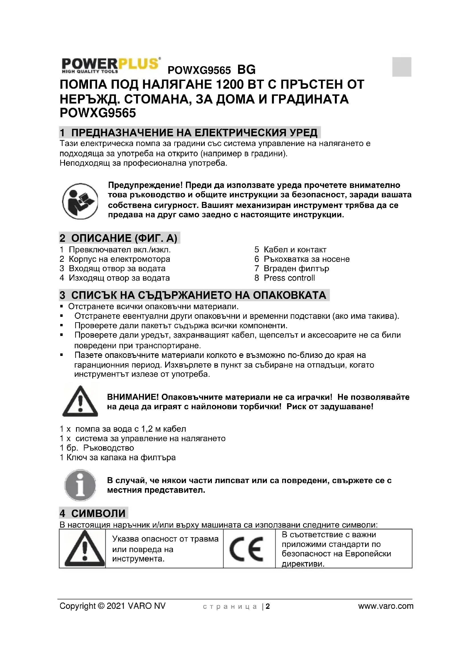 - 14 ДЕКЛАРАЦИЯ ЗА СЪОТВЕТСТВ POWXG9565 BG Copyright © 2021 VARO NV с т р а н и ц а | 2 www.varo.com ПОМПА ПОД НАЛЯГАНЕ 1200 ВТ С ПРЪСТЕН ОТ НЕРЪЖД. СТОМАНА, ЗА ДОМА И ГРАДИНАТА POWXG9565 1 ПРЕДНАЗНАЧЕНИЕ НА ЕЛЕКТРИЧЕСКИЯ УРЕД Тази електрическа помпа за градини със система управление на налягането е подходяща за употреба на открито (например в градини). Неподходящ за професионална употреба. Предупреждение! Преди да използвате уреда прочетете внимателно това ръководство и общите инструкции за безопасност, заради вашата собствена сигурност. Вашият механизиран инструмент трябва да се предава на друг само заедно с настоящите инструкции. 2 ОПИСАНИЕ (ФИГ. A) 1 Превключвател вкл./изкл. 2 Корпус на електромотора 3 Входящ отвор за водата 4 Изходящ отвор за водата 5 Кабел и контакт 6 Ръкохватка за носене 7 Вграден филтър 8 Press controll 3 СПИСЪК НА СЪДЪРЖАНИЕТО НА ОПАКОВКАТА p. 9