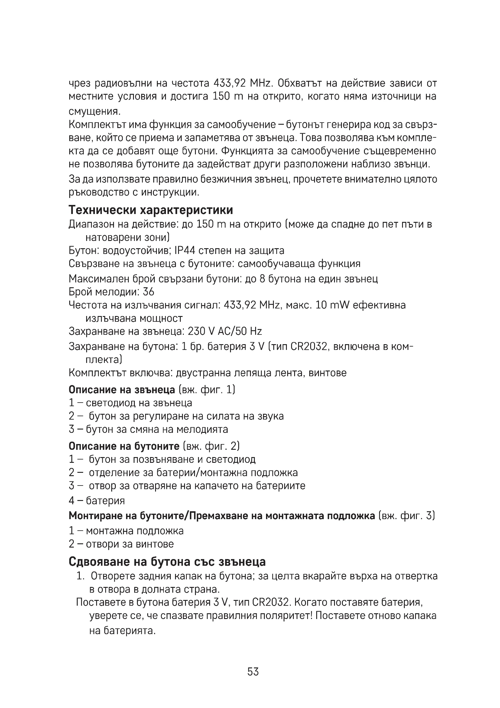 Комплектът има функция за самообучение – бутонът генерира код за свърз- ване, който се приема и запаметява от звънеца. Това позволява към компле- кта да се добавят още бутони. Функцията за самообучение същевременно не позволява бутоните да задействат други разположени наблизо звънци. За да използвате правилно безжичния звънец, прочетете внимателно цялото ръководство с инструкции. Технически характеристики Диапазон на действие: до 150 m на открито (може да спадне до пет пъти в натоварени зони) Бутон: водоустойчив; IP44 степен на защита Свързване на звънеца с бутоните: самообучаваща функция Максимален брой свързани бутони: до 8 бутона на един звънец Брой мелодии: 36 Честота на излъчвания сигнал: 433,92 MHz, макс. 10 mW ефективна излъчвана мощност Захранване на звънеца: 230 V AC/50 Hz Захранване на бутона: 1 бр. батерия 3 V (тип CR2032, включена в ком-