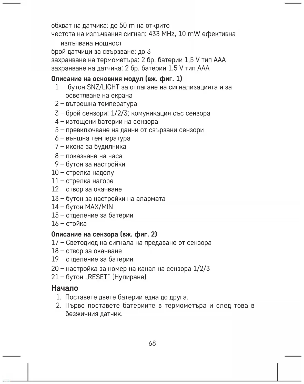 Натиснете бутона SNZ/LIGHT (ПОВТАРЯНЕ НА АЛАРМАТА И ОСВЕ- ТЯВАНЕ НА ЕКРАНА), когато алармата прозвучи, за да я отложите с около 5 минути. иконата ще мига на екрана. За да отмените функцията за отлагане, натиснете който и да е бутон освен SNZ/ LIGHT (ОТЛАГАНЕ НА АЛАРМАТА И ОСВЕТЯВАНЕ НА ЕКРАНА). Ако не желаете да използвате функцията за отлагане, натиснете който и да е бутон освен SNZ/LIGHT (ОТЛАГАНЕ НА АЛАРМАТА И ОСВЕТЯВАНЕ НА ЕКРАНА), когато алармата прозвучи; алармата ще се включи отново на следващия ден. Ако не натиснете бутон, докато алармата звучи, алармата ще бъде активна за 2 минути и след това ще се включи на следващия ден. Натиснете бутона SNZ/LIGHT (ОТЛАГАНЕ НА АЛАРМАТА И ОСВЕТЯ- ВАНЕ НА ЕКРАНА), докато сте в стандартен режим, за да активирате осветяването на дисплея за 5 секунди. Памет за измерени стойности Натиснете неколкократно бутона , за да се покажат макси- малните и минималните отчитания на вътрешната и външната температура. За да изтриете паметта, задръжте бутон . Инструкции за безопасност и предупреждения Преди да използвате устройството, прочетете ръководството за потребителя. Спазвайте инструкциите за безопасност, изложени в настоящото ръководство. Уредът е проектиран да работи безпро- блемно в продължение на много години, ако се използва правилно.