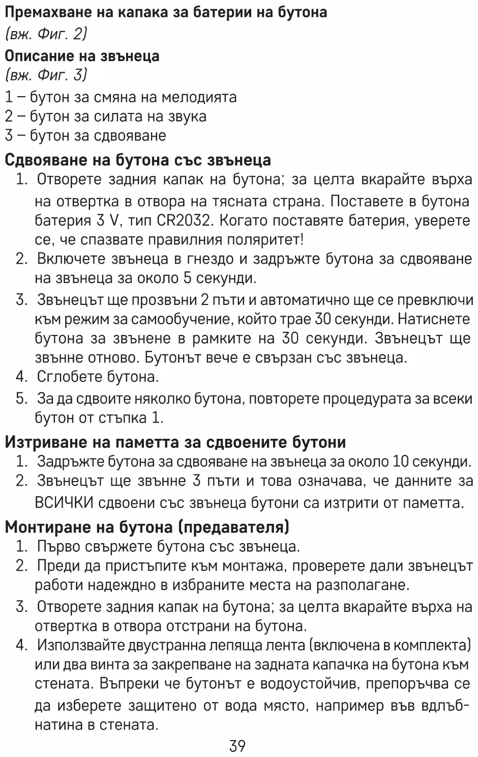 - Периодично проверявайте работата на бутона на звънеца и своевременно сменяйте батерията. Използвайте само качест- вени алкални батерии с предписаните параметри.