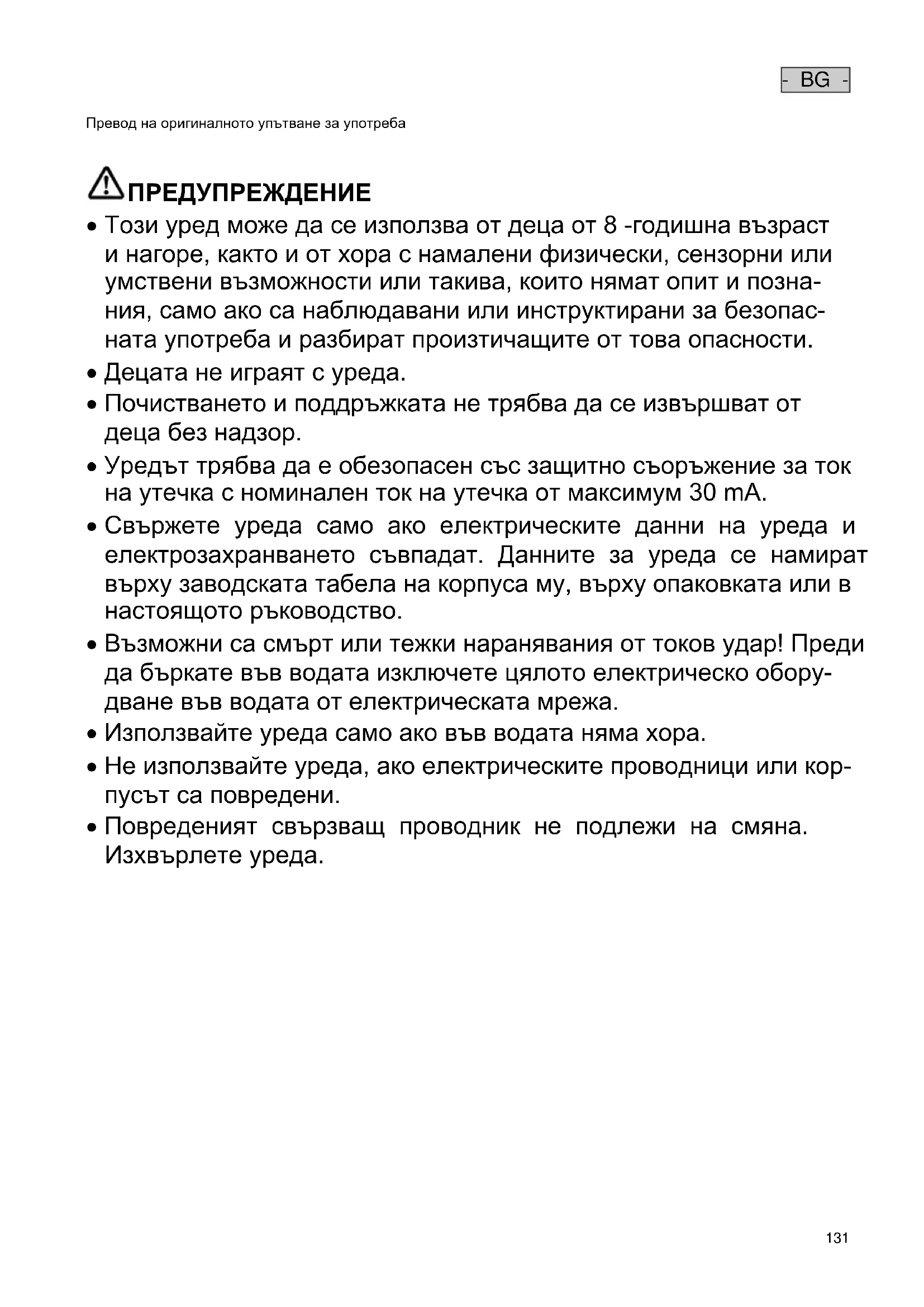 ПРЕДУПРЕЖДЕНИЕ ПРЕДУПРЕЖДЕНИЕ Този уред може да се използва от деца от 8 -годишна възраст и нагоре, както и от хора с намалени физически, сензорни или умствени възможности или такива, които нямат опит и позна- ния, само ако са наблюдавани или инструктирани за безопас- ната употреба и разбират произтичащите от това опасности. Децата не играят с уреда. Почистването и поддръжката не трябва да се извършват от деца без надзор. Уредът трябва да е обезопасен със защитно съоръжение за ток на утечка с номинален ток на утечка от максимум 30 mA. Свържете уреда само ако електрическите данни на уреда и електрозахранването съвпадат. Данните за уреда се намират върху заводската табела на корпуса му, върху опаковката или в настоящото ръководство. Възможни са смърт или тежки наранявания от токов удар! Преди да бъркате във водата изключете цялото електрическо обору- дване във водата от електрическата мрежа. Използвайте уреда само ако във водата няма хора. Не използвайте уреда, ако електрическите проводници или кор- пусът са повредени. Повреденият свързващ проводник не подлежи на смяна. Изхвърлете уреда.- BG -