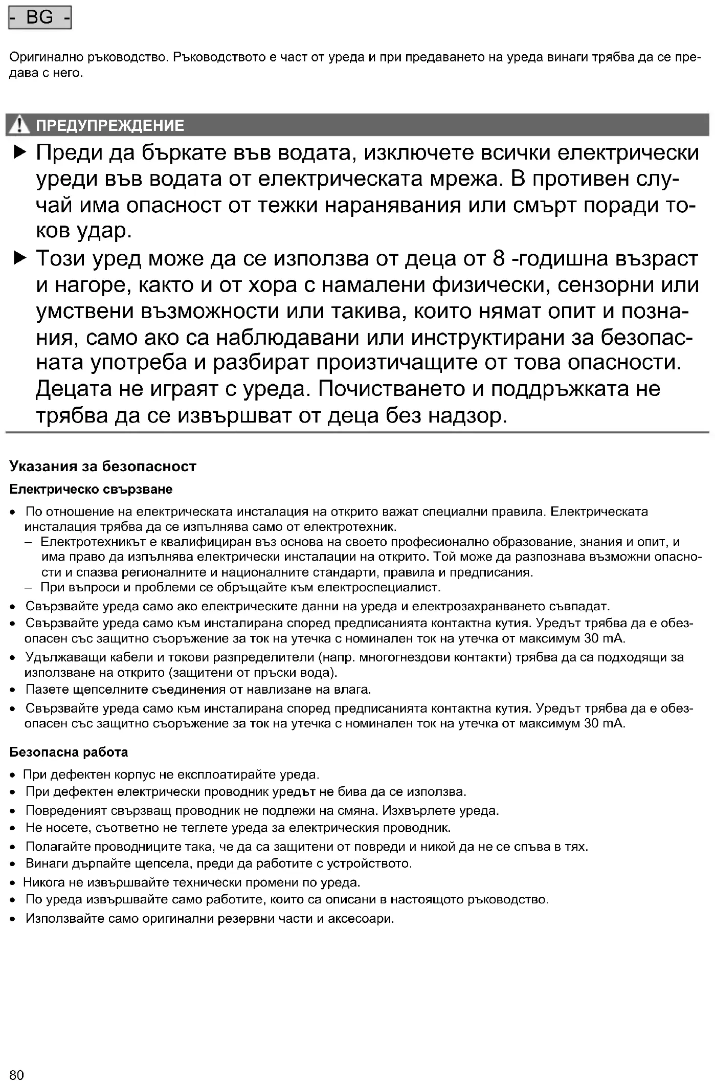 - BG - Оригинално ръководство. Ръководството е част от уреда и при предаването на уреда винаги трябва да се пре- дава с него.