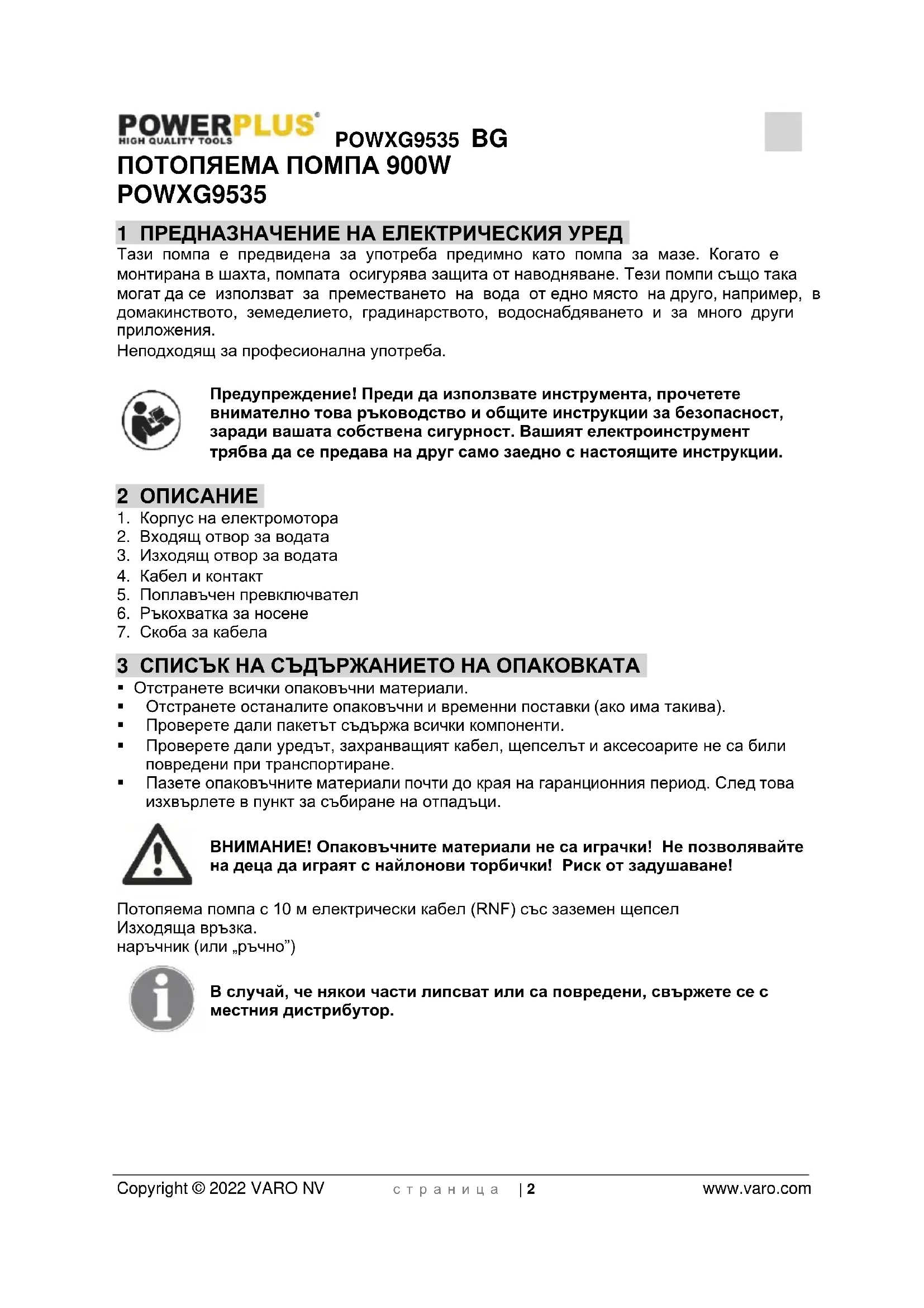- 16 ДЕКЛАРАЦИЯ ЗА СЪОТВЕТСТВИЕ POWXG9535 BG Copyright © 2022 VARO NV с т р а н и ц а | 2 www.varo.com ПОТОПЯЕМА ПОМПА 900W POWXG9535 1 ПРЕДНАЗНАЧЕНИЕ НА ЕЛЕКТРИЧЕСКИЯ УРЕД Тази помпа е предвидена за употреба предимно като помпа за мазе. Когато е монтирана в шахта, помпата осигурява защита от наводняване. Тези помпи също така могат да се използват за преместването на вода от едно място на друго, например, в домакинството, земеделието, градинарството, водоснабдяването и за много други приложения. Неподходящ за професионална употреба. Предупреждение! Преди да използвате инструмента, прочетете внимателно това ръководство и общите инструкции за безопасност, заради вашата собствена сигурност. Вашият електроинструмент трябва да се предава на друг само заедно с настоящите инструкции. 2 ОПИСАНИЕ p. 8