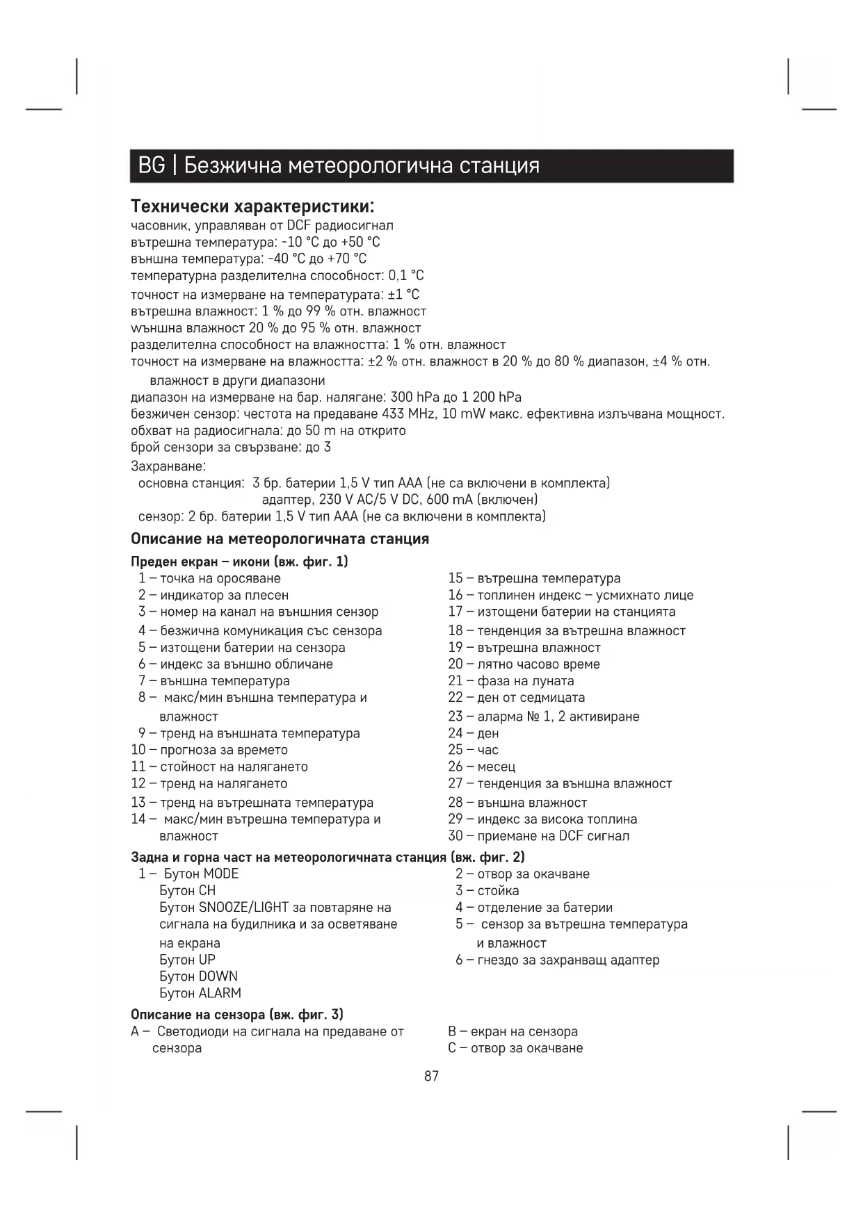 15 – вътрешна температура 16 – топлинен индекс – усмихнато лице 17 – изтощени батерии на станцията 18 – тенденция за вътрешна влажност 19 – вътрешна влажност 20 – лятно часово време 21 – фаза на луната 22 – ден от седмицата 23 – аларма № 1, 2 активиране 24 – ден 25 – час 26 – месец 27 – тенденция за външна влажност 28 – външна влажност 29 – индекс за висока топлина 30 – приемане на DCF сигнал Задна и горна част на метеорологичната станция (вж. фиг. 2) 1 – Бутон MODE Бутон CH Бутон SNOOZE/LIGHT за повтаряне на сигнала на будилника и за осветяване