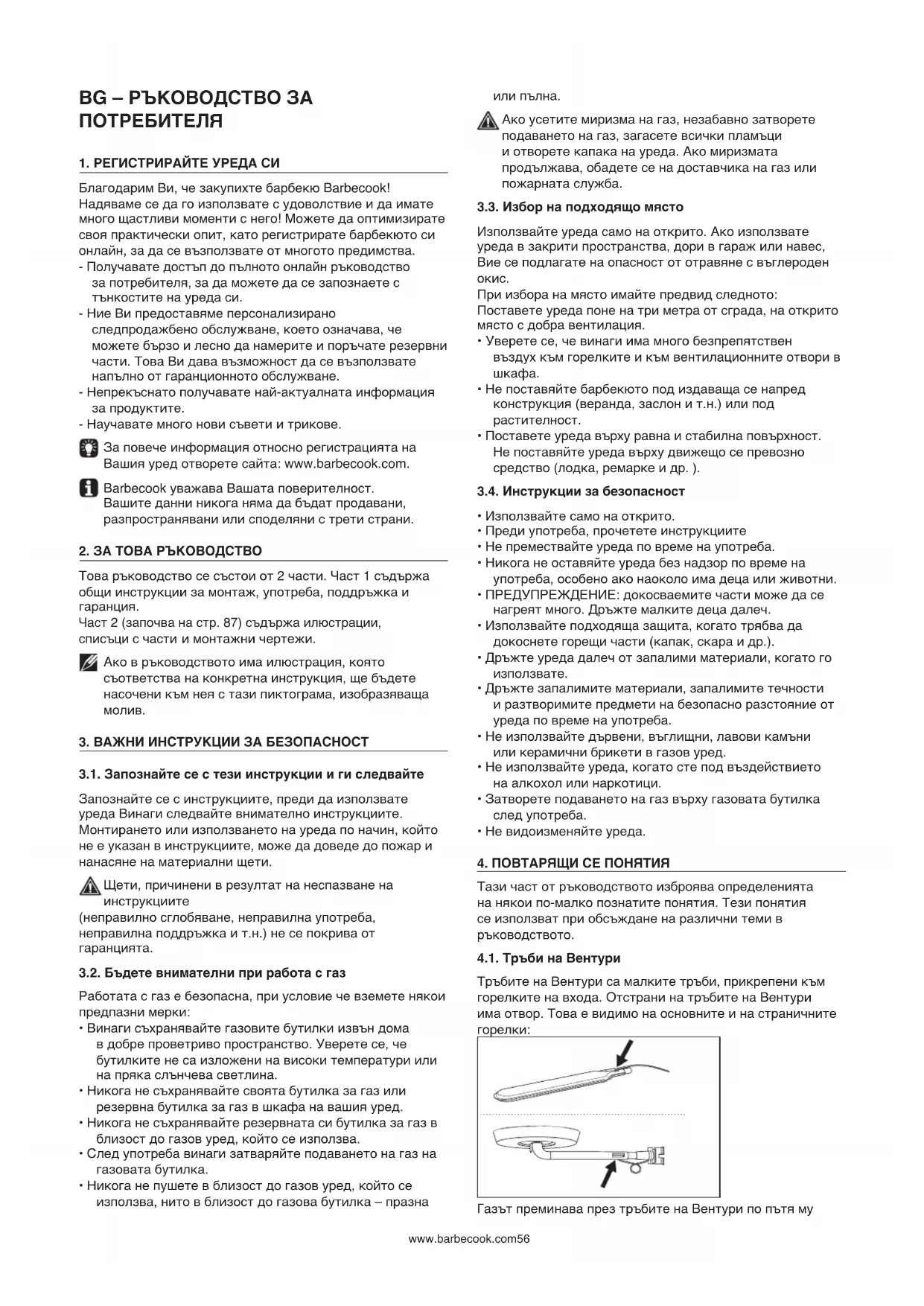 Благодарим Ви, че закупихте барбекю Barbecook! Надяваме се да го използвате с удоволствие и да имате много щастливи моменти с него! Можете да оптимизирате своя практически опит, като регистрирате барбекюто си онлайн, за да се възползвате от многото предимства. - Получавате достъп до пълното онлайн ръководство за потребителя, за да можете да се запознаете с тънкостите на уреда си. - Ние Ви предоставяме персонализирано следпродажбено обслужване, което означава, че можете бързо и лесно да намерите и поръчате резервни части. Това Ви дава възможност да се възползвате напълно от гаранционното обслужване. - Непрекъснато получавате най-актуалната информация за продуктите. - Научавате много нови съвети и трикове. За повече информация относно регистрацията на Вашия уред отворете сайта: www.barbecook.com. Barbecook уважава Вашата поверителност. Вашите данни никога няма да бъдат продавани, разпространявани или споделяни с трети страни.
