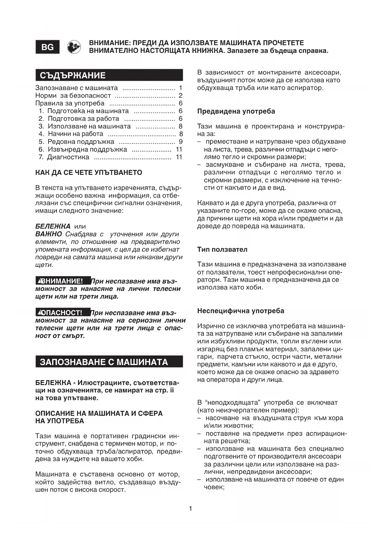 Преносима градинска духалка / Преносим градински аспиратор УПЪТВАНЕ ЗА УПОТРЕБА ВНИМАНИЕ: преди да използвате машината прочетете внимателно настоящата книжка.