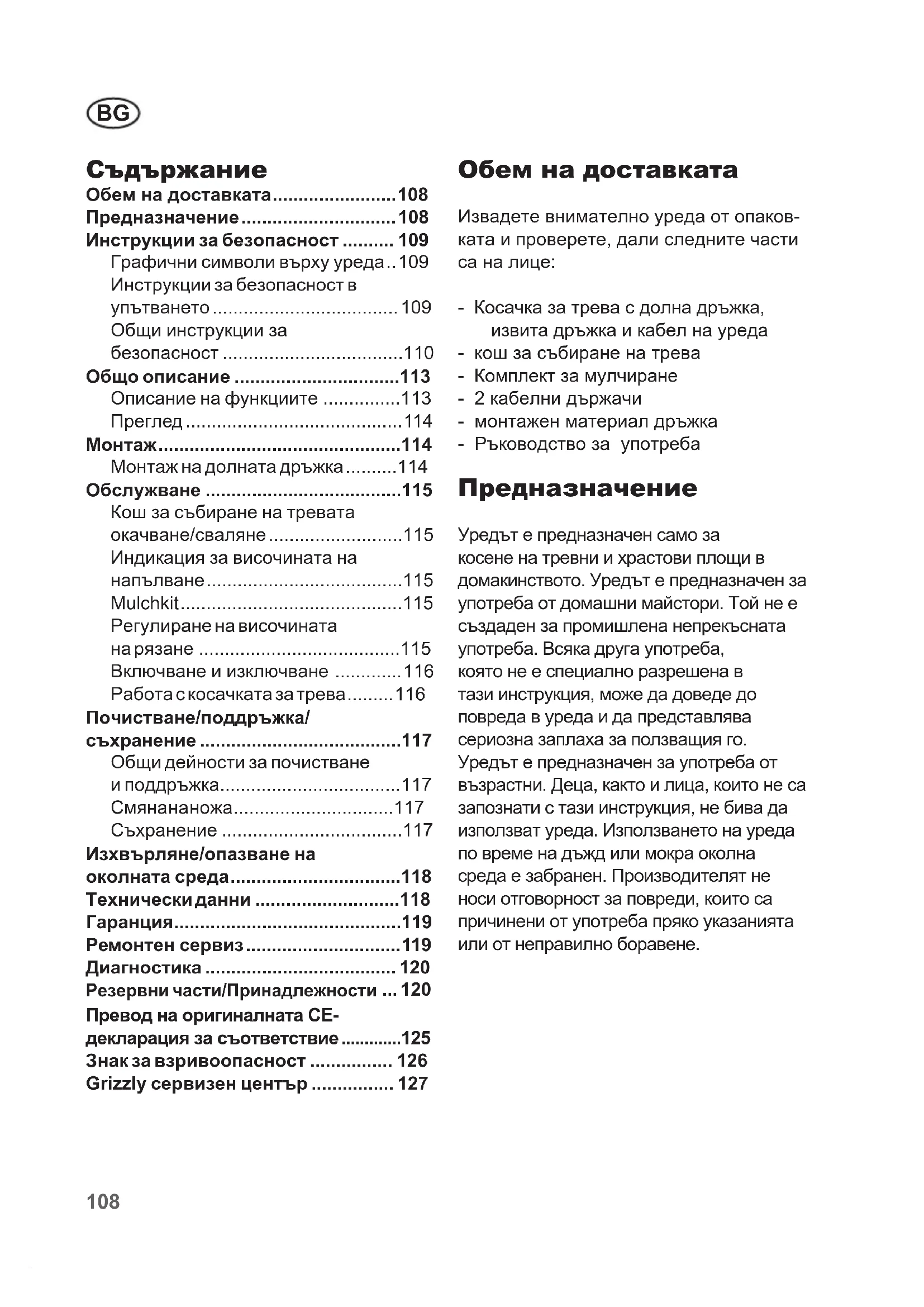 Обем на доставката Извадете внимателно уреда от опаков- ката и проверете, дали следните части са на лице: - Косачка за трева с долна дръжка, извита дръжка и кабел на уреда - кош за събиране на трева - Комплект за мулчиране - 2 кабелни държачи - монтажен материал дръжка - Ръководство за употреба Предназначение Уредът е предназначен само за косене на тревни и храстови площи в домакинството. Уредът е предназначен за употреба от домашни майстори. Той не е създаден за промишлена непрекъсната употреба. Всяка друга употреба, която не е специално разрешена в тази инструкция, може да доведе до повреда в уреда и да представлява сериозна заплаха за ползващия го. Уредът е предназначен за употреба от възрастни. Деца, както и лица, които не са запознати с тази инструкция, не бива да използват уреда. Използването на уреда по време на дъжд или мокра околна среда е забранен. Производителят не носи отговорност за повреди, които са причинени от употреба пряко указанията или от неправилно боравене. Превод на оригиналната CE- декларация за съответствие .............125 Знак за взривоопасност ................ 126 Grizzly сервизен център ................ 127BG
