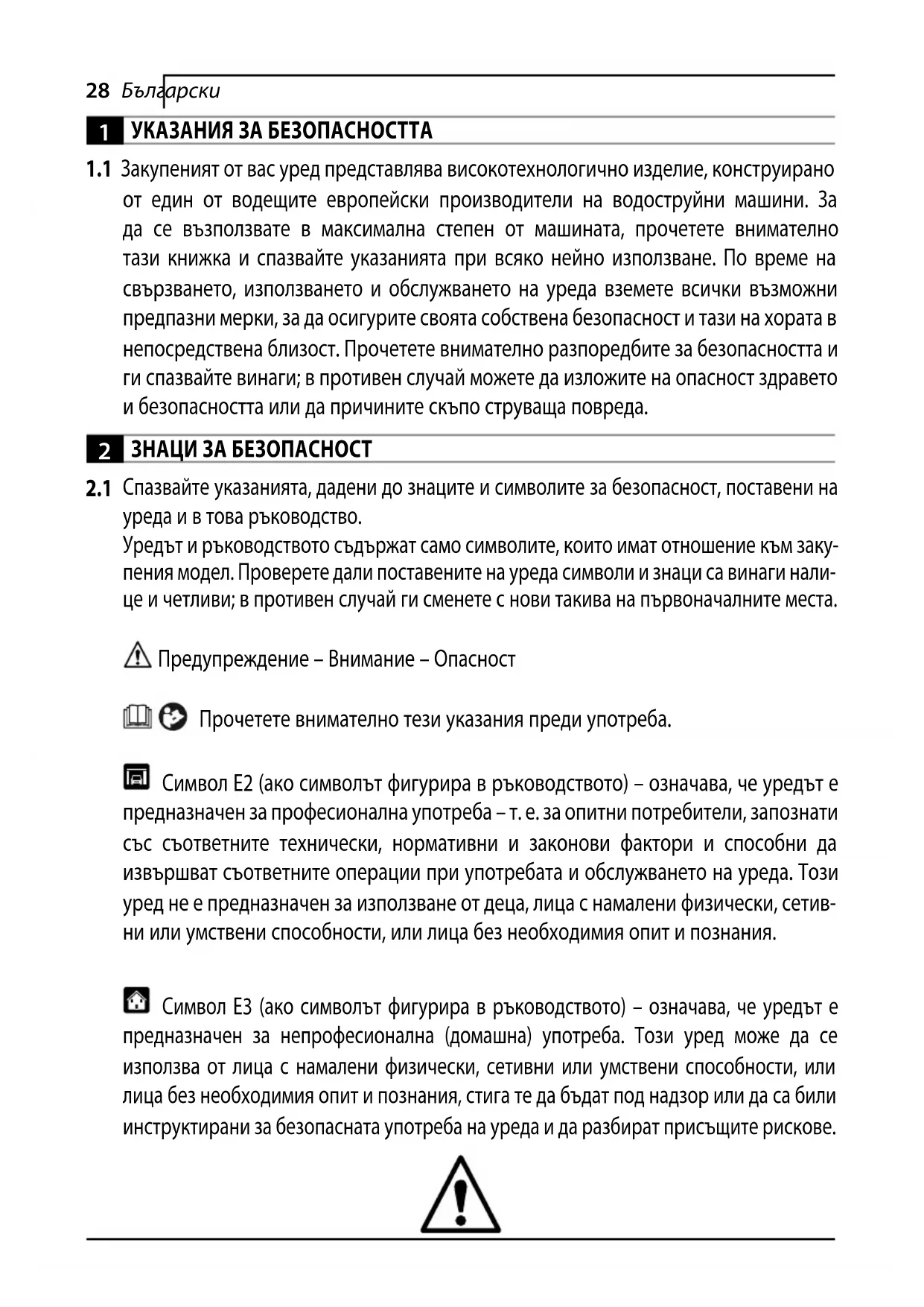 Спазвайте указанията, дадени до знаците и символите за безопасност, поставени на уреда и в това ръководство. Уредът и ръководството съдържат само символите, които имат отношение към заку- пения модел. Проверете дали поставените на уреда символи и знаци са винаги нали- це и четливи; в противен случай ги сменете с нови такива на първоначалните места. Предупреждение – Внимание – Опасност Прочетете внимателно тези указания преди употреба. Символ E2 (ако символът фигурира в ръководството) – означава, че уредът е предназначен за професионална употреба – т. е. за опитни потребители, запознати със съответните технически, нормативни и законови фактори и способни да извършват съответните операции при употребата и обслужването на уреда. Този уред не е предназначен за използване от деца, лица с намалени физически, сетив- ни или умствени способности, или лица без необходимия опит и познания. Символ E3 (ако символът фигурира в ръководството) – означава, че уредът е предназначен за непрофесионална (домашна) употреба. Този уред може да се използва от лица с намалени физически, сетивни или умствени способности, или лица без необходимия опит и познания, стига те да бъдат под надзор или да са били инструктирани за безопасната употреба на уреда и да разбират присъщите рискове.29Български Подвижни части. Не пипайте. 0 „Изключено“ положение