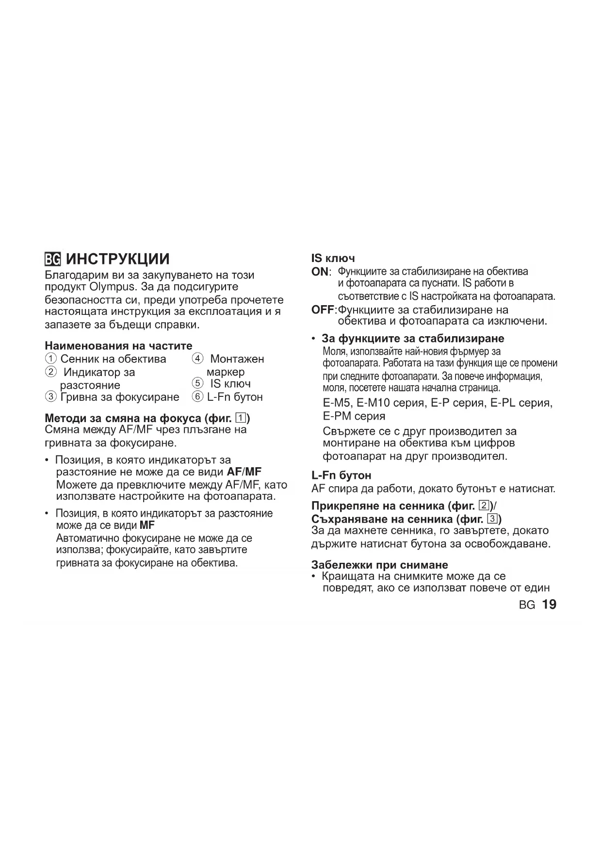 - За функциите за стабилизиране Моля, използвайте най-новия фърмуер за фотоапарата. Работата на тази функция ще се промени при следните фотоапарати. За повече информация, моля, посетете нашата начална страница. E-M5, E-M10 серия, E-P серия, E-PL серия, E-PM серия Свържете се с друг производител за монтиране на обектива към цифров фотоапарат на друг производител. L-Fn бутон AF спира да работи, докато бутонът е натиснат. Прикрепяне на сенника (фиг. 2)/ Съхраняване на сенника (фиг. 3) За да махнете сенника, го завъртете, докато държите натиснат бутона за освобождаване. Забележки при снимане