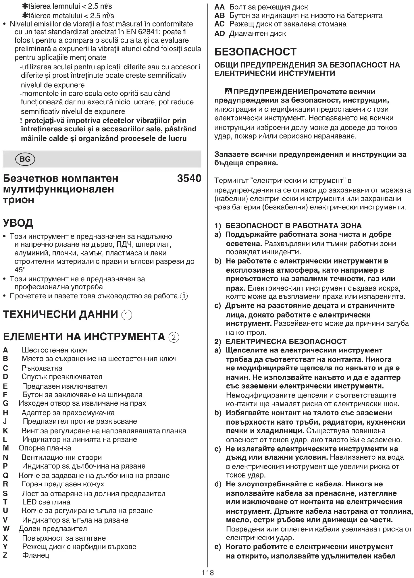 P Индикатор за дълбочина на рязане Q Копче за задаване на дълбочина на рязане R Горен предпазен кожух S Лост за отваряне на долния предпазител T LED светлина U Копче за регулиране ъгъла на рязане V Индикатор за ъгъла на рязане W Долен предпазител X Повърхност за затягане Y Режещ диск с карбидни върхове Z Фланец119 електрически инструмент, който не може да бъде контролиран от ключа е опасен и трябва да бъде