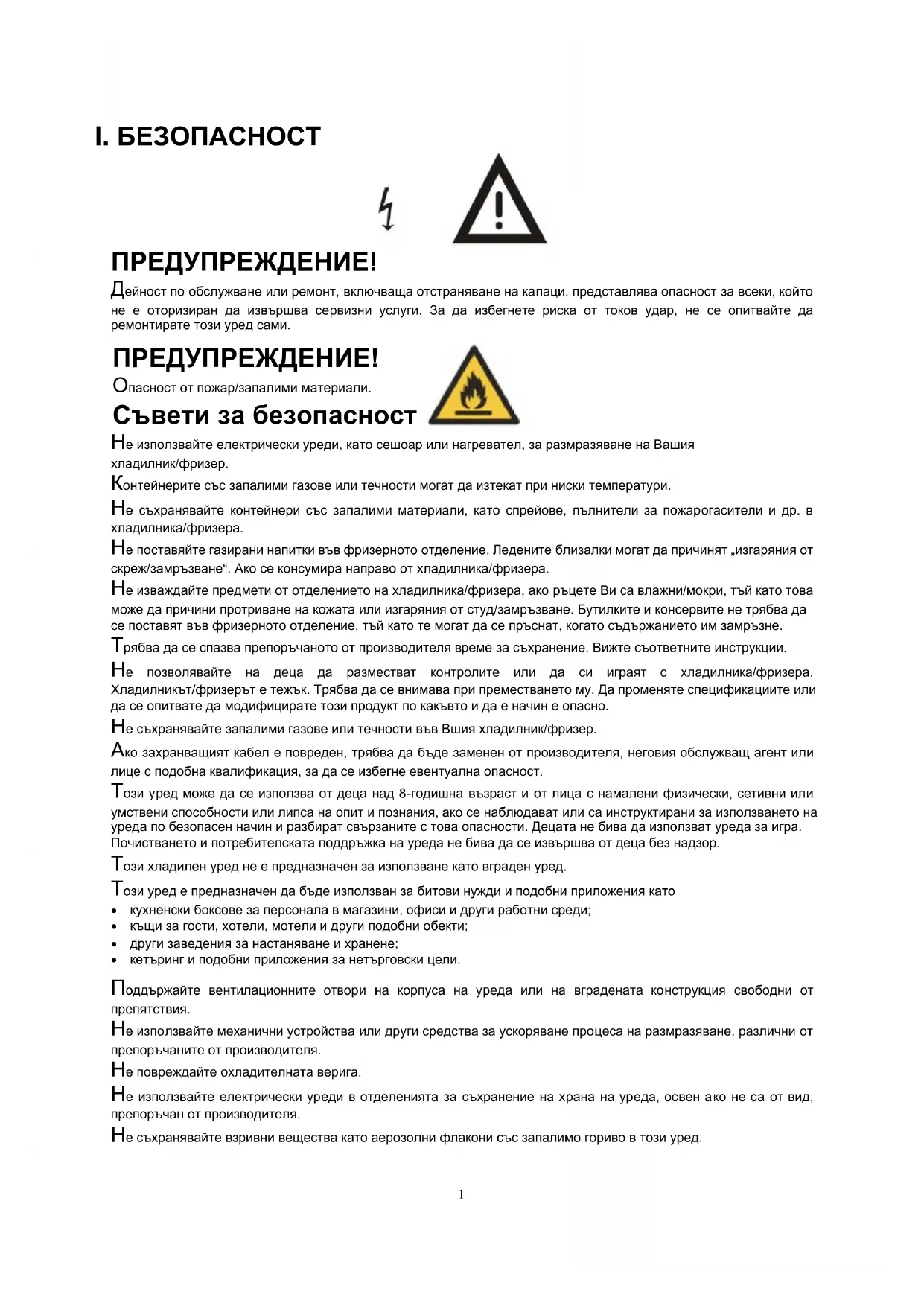 ПРЕДУПРЕЖДЕНИЕ! Дейност по обслужване или ремонт, включваща отстраняване на капаци, представлява опасност за всеки, който не е оторизиран да извършва сервизни услуги. За да избегнете риска от токов удар, не се опитвайте да ремонтирате този уред сами. ПРЕДУПРЕЖДЕНИЕ! Опасност от пожар/запалими материали. Съвети за безопасност Не използвайте електрически уреди, като сешоар или нагревател, за размразяване на Вашия хладилник/фризер. Контейнерите със запалими газове или течности могат да изтекат при ниски температури. Не съхранявайте контейнери със запалими материали, като спрейове, пълнители за пожарогасители и др. в хладилника/фризера. Не поставяйте газирани напитки във фризерното отделение. Ледените близалки могат да причинят „изгаряния от скреж/замръзване“. Ако се консумира направо от хладилника/фризера. Не изваждайте предмети от отделението на хладилника/фризера, ако ръцете Ви са влажни/мокри, тъй като това може да причини протриване на кожата или изгаряния от студ/замръзване. Бутилките и консервите не трябва да се поставят във фризерното отделение, тъй като те могат да се пръснат, когато съдържанието им замръзне. Трябва да се спазва препоръчаното от производителя време за съхранение. Вижте съответните инструкции. Не позволявайте на деца да разместват контролите или да си играят с хладилника/фризера. Хладилникът/фризерът е тежък. Трябва да се внимава при преместването му. Да променяте спецификациите или да се опитвате да модифицирате този продукт по какъвто и да е начин е опасно. Не съхранявайте запалими газове или течности във Вшия хладилник/фризер. Ако захранващият кабел е повреден, трябва да бъде заменен от производителя, неговия обслужващ агент или лице с подобна квалификация, за да се избегне евентуална опасност. Този уред може да се използва от деца над 8-годишна възраст и от лица с намалени физически, сетивни или умствени способности или липса на опит и познания, ако се наблюдават или са инструктирани за използването на уреда по безопасен начин и разбират свързаните с това опасности. Децата не бива да използват уреда за игра. Почистването и потребителската поддръжка на уреда не бива да се извършва от деца без надзор. Този хладилен уред не е предназначен за използване като вграден уред. Този уред е предназначен да бъде използван за битови нужди и подобни приложения като