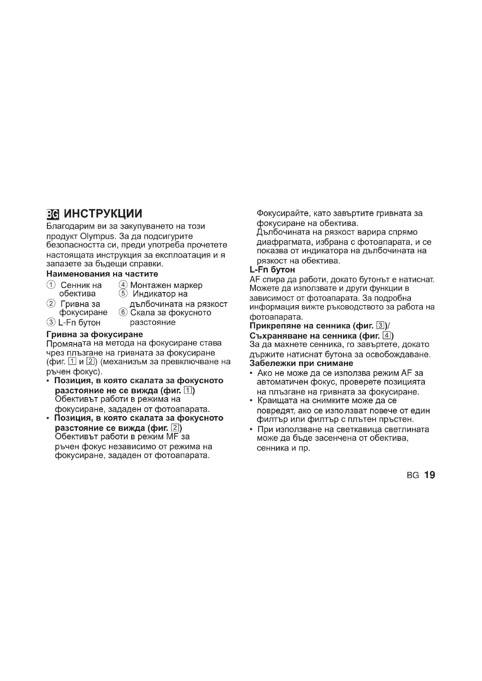 зстояние се вижда (фиг. 2) Обективът работи в режим MF за ръчен фокус независимо от режима на фокусиране, зададен от фотоапарата. Фокусирайте, като завъртите гривната за фокусиране на обектива. Дълбочината на рязкост варира спрямо диафрагмата, избрана с фотоапарата, и се показва от индикатора на дълбочината на рязкост на обектива. L-Fn бутон AF спира да работи, докато бутонът е натиснат. Можете да използвате и други функции в зависимост от фотоапарата. За подробна информация вижте ръководството за работа на фотоапарата. Прикрепяне на сенника (фиг. 3)/ Съхраняване на сенника (фиг. 4) За да махнете сенника, го завъртете, докато държите натиснат бутона за освобождаване. Забележки при снимане