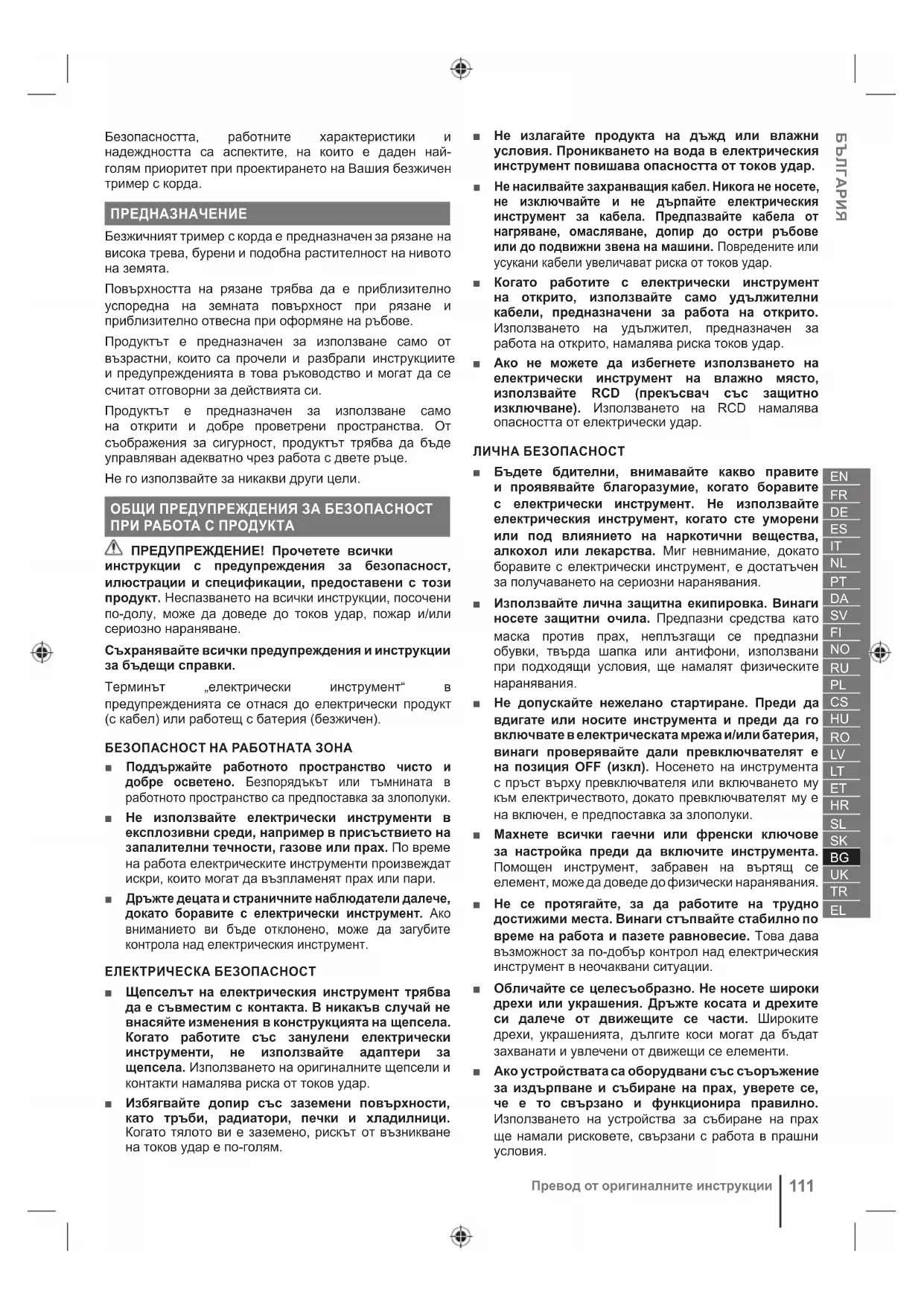 ■ Презареждайте единствено със зарядното устройство, посочено от производителя. Зарядно устройство, подходящо за зареждане на един вид батерии, може да предизвика риск от пожар, ако бъде използвано за други батерии. ■ Използвайте електрически инструменти с батерии единствено със специално предназначените за тях батерии. Използването на всякакви други батерии може да създаде риск от нараняване и пожар. ■ Когато батерията не се използва, съхранявайте я далеч от други метални обекти, като например кламери, монети, ключове, гвоздеи, гайки или други малки метални обекти, които могат да направят връзка между клемите. Късото съединение от клемите може да доведе до изгаряния или пожар. ■ При неправилно използване батерията може да отдели течност; избягвайте контакт. Ако случайно настъпи контакт, промийте с вода. Ако течността влезе в контакт с очите, потърсете незабавно медицинска помощ. Отделената от батерията течност може да причини възпаление или изгаряния. ■ Не използвайте акумулаторна батерия или инструмент, които са повредени или променени по някакъв начин. Повредените или променени батерии могат да работят по непредсказуем начин, което да доведе до пожар, взрив или опасност от наранявания. ■ Не излагайте акумулаторна батерия или инструмент на огън или прекалено висока температура. Излагането на огън или на температура над 130 °C може да причини взрив. ■ Следвайте всички инструкции за зареждане и не зареждайте акумулаторната батерия или инструмента извън температурния диапазон, посочен в инструкциите. Неправилното зареждане или зареждането при температури извън посочения диапазон може да повреди батерията и да увеличи риска от пожар. СЕРВИЗНО ОБСЛУЖВАНЕ ■ Ремонтът на електрическите инструменти трябва да се извършва само от квалифицирани специалисти и само с използването на оригинални резервни части. По този начин се гарантира поддържането на безопасност при работа с електрическия инструмент. ■ Никога не обслужвайте повредени акумулаторни батерии. Обслужването на акумулаторните батерии трябва да се извършва само от производителя или от оторизирани доставчици на услуги по сервизно обслужване. ПРЕДУПРЕЖДЕНИЯ ЗА БЕЗОПАСНОСТ ПРИ РАБОТА С ТРИМЕРА ЗА ТРЕВА ■ Не използвайте машината при лоши метеорологични условия, особено когато има риск от мълнии. Това намалява риска от поразяване от мълния. ■ Проверете внимателно зоната, в която ще използвате машината, за диви животни. Дивите животни може да бъдат наранени от машината по време на работа. ■ Проверете внимателно мястото, на което ще се използва машината, и премахнете всички камъни, пръчки, жици, кости и други чужди предмети. Изхвърлените предмети може да причинят физическо нараняване. ■ Преди да използвате машината, винаги я проверявайте визуално, за да се уверите, че диска или острието и модулът на диска или острието не са повредени. Повредени части повишават риска от нараняване.БЪЛГАРИЯ