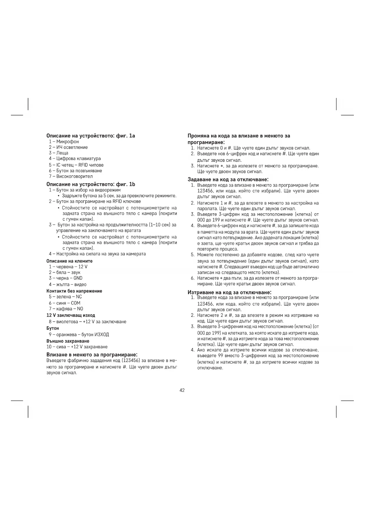 Ръководство42 Описание на устройството: фиг. 1a 1 – Микрофон 2 – ИЧ осветление 3 – Леща 4 – Цифрова клавиатура 5 – IC четец – RFID чипове 6 – Бутон за позвъняване 7 – Високоговорител Описание на устройството: фиг. 1b 1 – Бутон за избор на видеорежим