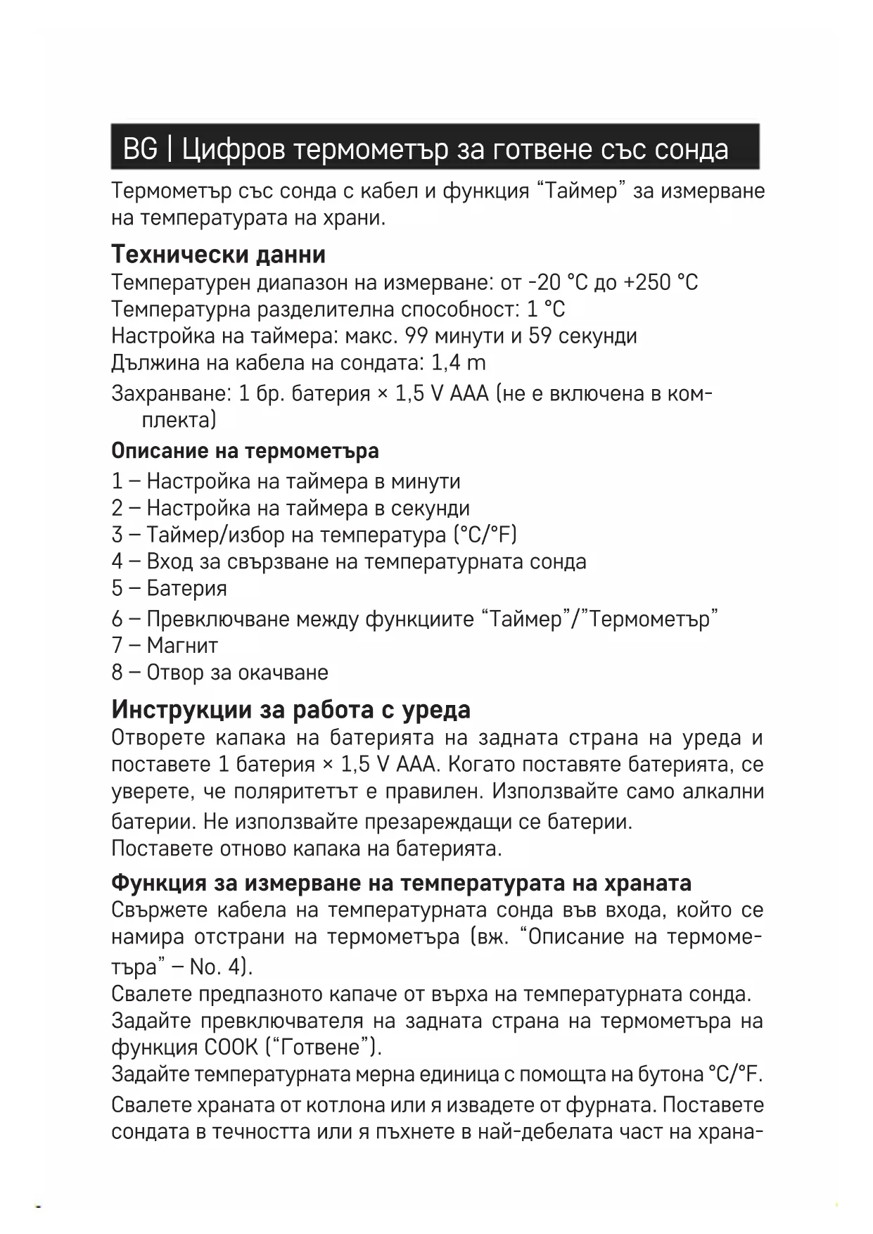 Описание на термометъра 1 – Настройка на таймера в минути 2 – Настройка на таймера в секунди 3 – Таймер/избор на температура (°C/°F) 4 – Вход за свързване на температурната сонда 5 – Батерия 6 – Превключване между функциите “Таймер”/”Термометър” 7 – Магнит 8 – Отвор за окачване Инструкции за работа с уреда Отворете капака на батерията на задната страна на уреда и поставете 1 батерия × 1,5 V AAA. Когато поставяте батерията, се уверете, че поляритетът е правилен. Използвайте само алкални батерии. Не използвайте презареждащи се батерии. Поставете отново капака на батерията. Функция за измерване на температурата на храната Свържете кабела на температурната сонда във входа, който се намира отстрани на термометъра (вж. “Описание на термоме- търа” – No. 4). Свалете предпазното капаче от върха на температурната сонда. Задайте превключвателя на задната страна на термометъра на функция COOK (“Готвене”). Задайте температурната мерна единица с помощта на бутона °C/°F. Свалете храната от котлона или я извадете от фурната. Поставете сондата в течността или я пъхнете в най-дебелата част на храна-46 47 та. Върхът на сондата трябва да се намира възможно най-близо до центъра на храната. Не прилагайте прекалена сила, когато вкарвате сондата в храната. Изчакайте няколко секунди, докато покачването и спадането на температурата, показвано на течнокристалния дисплей, спре. Измерената температура ще се показва в лявата част на дисплея, в полето THERMO TEMP (“Измерена температура”). Аларма за температура Този термометър позволява да се зададе аларма при достигане на желаната температура. Задайте желаната температура на храната (от -20°C до +250°C, разделителна способност 1°C) с помощта на настройката на функцията за измерване на температурата на храната. Зададената температура ще се показва в дясната част на дисплея, в полето SET TEMP (“Зададена температура”). Когато храната достигне желаната температура, термометърът ще започне да издава кратки звукови сигнали и на дисплея ще се появи символ звънче. За да спрете звуковите сигнали, извадете сондата от входа ѝ или превключете на функция TIMER (“Таймер”). Не оставяйте температурната сонда в храната по време на го- твене или печене. Извадете я непосредствено след измерване на температурата. Функция “Таймер” Задайте превключвателя на задната страна на термометъра на функция TIMER (“Таймер”).