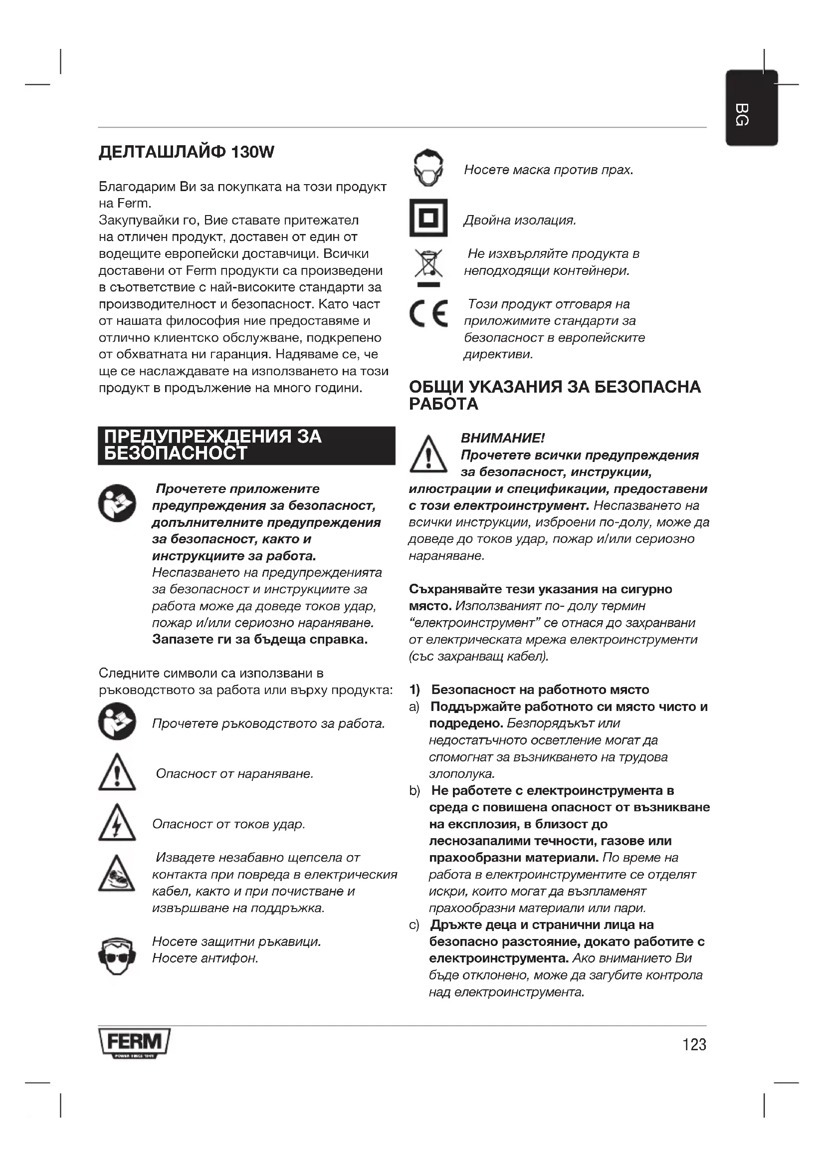ДЕЛТАШЛАЙФ 130W Благодарим Ви за покупката на този продукт на Ferm. Закупувайки го, Вие ставате притежател на отличен продукт, доставен от един от водещите европейски доставчици. Всички доставени от Ferm продукти са произведени в съответствие с най-високите стандарти за производителност и безопасност. Като част от нашата философия ние предоставяме и отлично клиентско обслужване, подкрепено от обхватната ни гаранция. Надяваме се, че ще се наслаждавате на използването на този продукт в продължение на много години. ПРЕДУПРЕЖДЕНИЯ ЗА БЕЗОПАСНОСТ Прочетете приложените предупреждения за безопасност, допълнителните предупреждения за безопасност, както и инструкциите за работа. Неспазването на предупрежденията за безопасност и инструкциите за работа може да доведе токов удар, пожар и/или сериозно нараняване. Запазете ги за бъдеща справка. Следните символи са използвани в ръководството за работа или върху продукта: Прочетете ръководството за работа. Опасност от нараняване. Опасност от токов удар. Извадете незабавно щепсела от контакта при повреда в електрическия кабел, както и при почистване и извършване на поддръжка. Носете защитни ръкавици. Носете антифон. Носете маска против прах. Двойна изолация. Не изхвърляйте продукта в неподходящи контейнери. Този продукт отговаря на приложимите стандарти за безопасност в европейските