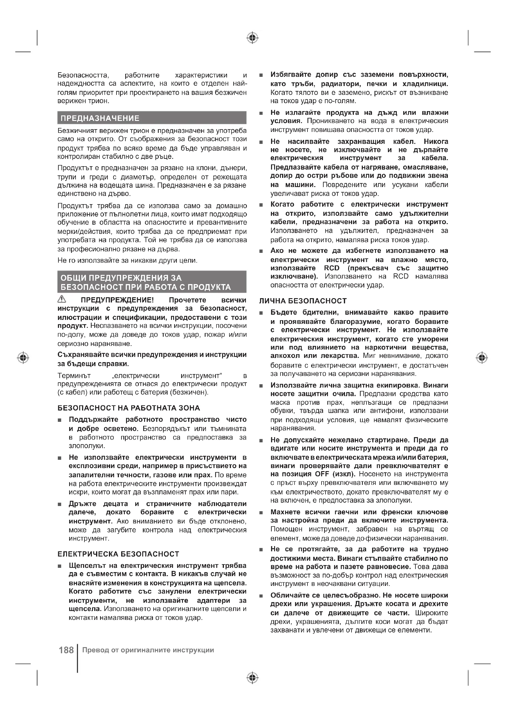 Brzdu reťaze nastavte do polohy pre chod tak, že uchopíte hornú časť páčky brzdy reťaze a potiahnete smerom k prednej rukoväti, až kým nezaznie kliknutie. Potiahnite uvoľnenie vypínača. Stlačte vypínač škrtiacej klapky. POZNÁMKA: Zastavenie výrobku: Brzdu reťaze aktivujete tak, že otočíte ľavou rukou okolo prednej rukoväte. Chrbtom ruky zatlačte páčku brzdy reťaze smerom k lište, kým sa reťaz rýchlo otáča. Uvoľnite spúšťač.188 Превод от оригиналните инструкции Безопасността, работните характеристики и надеждността са аспектите, на които е отделен най- голям приоритет при проектирането на вашия безжичен верижен трион. ПРЕДНАЗНАЧЕНИЕ Безжичният верижен трион е предназначен за употреба само на открито. От съображения за безопасност този продукт трябва по всяко време да бъде управляван и контролиран стабилно с две ръце. Продуктът е предназначен за рязане на клони, дънери, трупи и греди с диаметър, определен от режещата дължина на водещата шина. Предназначен е