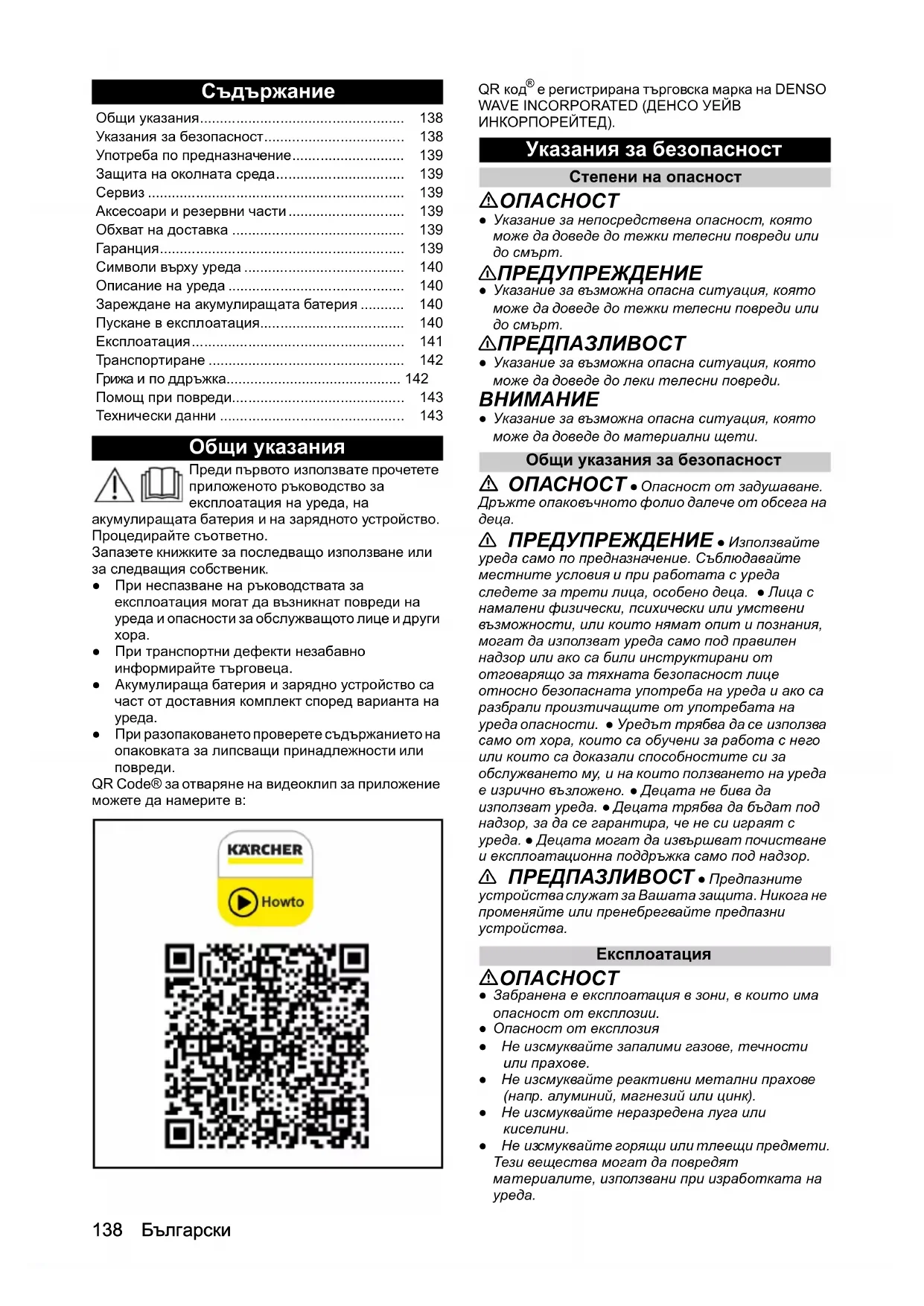 За експлоатацията е необходима акумулираща батерия от платформата KÄRCHER Battery Power (+) с номинално напрежение 18 V, както и подходящо зарядно устройство KÄRCHER с номинално напрежение 18 V, които не се съдържат в комплекта на доставката. Акумулиращи батерии и зарядни устройства, които не са включени в комплекта на доставката или необходимостта от които се яв ява допълнително, се предлагат като аксесоари. Защита на околната среда Опаковъчните материали подлежат на рециклиране. Моля, изхвърляйте опаковките по съобразен с околната среда начин. Електрическите и електронните уреди съдържат ценни материали, подлежащи на рециклиране, а често и съставни части, напр. батерии, акумулаторни батерии или масло, които при неправилно боравене или изхвърляне могат да представляват потенциална опасност за човешкото здраве и за ок олната среда. За правилното функциониране на уреда все пак тези съставни части са необходими. Обозначените с този символ уреди не трябва да бъдат изхвърляни заедно с битовите отпадъци. Указания за съставни вещества (REACH) Актуална информация за съставките ще намерите на интернет страница: www.kaercher.de/REACH