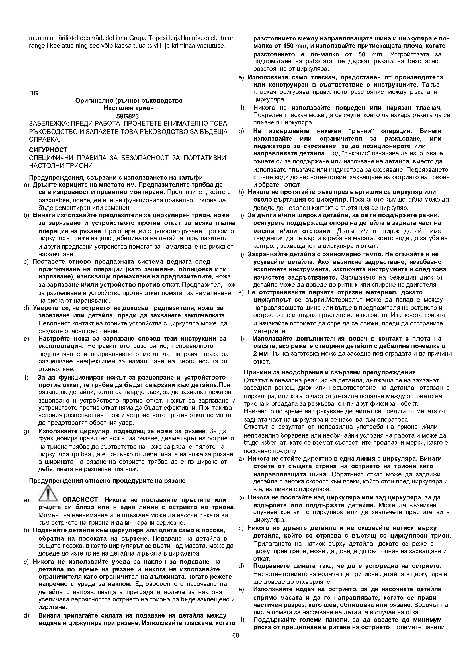 СПЕЦИФИЧНИ ПРАВИЛА ЗА БЕЗОПАСНОСТ ЗА ПОРТАТИВНИ НАСТОЛНИ ТРИОНИ Предупреждения, свързани с използването на калъфи a) Дръжте кориците на мястото им. Предпазителите трябва да са в изправност и правилно монтирани. Предпазител, който е разхлабен, повреден или не функционира правилно, трябва да бъде ремонтиран или заменен b) Винаги използвайте предпазителя за циркулярен трион, ножа за зарязване и устройството против откат за всяка пълна операция на рязане. При операции с цялостно рязане, при които циркулярът реже изцяло дебелината на детайла, предпазителят и други предпазни устройства помагат за намаляване на риска от нараняване. c) Поставете отново предпазната система веднага след приключване на операции (като зашиване, облицовка или изрязване), изискващи премахване на предпазителите, ножа за зарязване и/или устройство против откат. Предпазител, нож за разцепване и устройство против откат помагат за намаляване на риска от нараняване. d) Уверете се, че острието не докосва предпазителя, ножа за зарязване или детайла, преди да захванете закопчалката. Неволният контакт на горните устройства с циркуляра може да създаде опасно състояние. e) Настройте ножа за зарязване според тези инструкции за експлоатация. Неправилното разстояние, неправилното подравняване и подравняването могат да направят ножа за разцепване неефективен за намаляване на вероятността от отхвърляне. f) За да функционират ножът за разцепване и устройството против откат, те трябва да бъдат свързани към детайла.При рязане на детайли, които са твърде къси, за да захванат ножа за зацепване и устройството против откат, ножът за зарязване и устройството против откат няма да бъдат ефективни. При такива условия разцепващият нож и устройството против откат не могат да предотвратят обратния удар. g) Използвайте циркуляр, подходящ за ножа за рязане. За да функционира правилно ножът за рязане, диаметърът на острието на триона трябва да съответства на ножа за рязане, тялото на циркуляра трябва да е по-тънко от дебелината на ножа за рязане, а ширината на рязане на острието трябва да е по-широка от дебелината на разцепващия нож. Предупреждения относно процедурите на рязане a) ОПАСНОСТ: Никога не поставяйте пръстите или ръцете си близо или в една линия с острието на триона. Момент на невнимание или плъзгане може да насочи ръката ви към острието на триона и да ви нарани сериозно. b) Подавайте детайла към циркуляра или длета само в посока, обратна на посоката на въртене. Подаване на детайла в същата посока, в която циркулярът се върти над масата, може да доведе до изтегляне на детайла и ръката в циркуляра. c) Никога не използвайте уреда за наклон за подаване на детайла по време на рязане и никога не използвайте ограничителя като ограничител на дължината, когато режете напречно с уреда за наклон. Едновременното насочване на детайла с направляващата преграда и водача за наклона увеличава вероятността острието на триона да бъде заклещено и