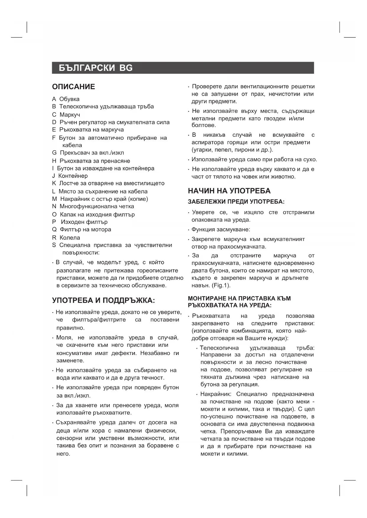 G Прекъсвач за вкл./изкл H Ръкохватка за пренасяне I Бутон за изваждане на контейнера J Контейнер K Лостче за отваряне на вместилището L Място за съхранение на кабела M Накрайник с остър край (копие) N Многофункционална четка O Капак на изходния филтър P Изходен филтър Q Филтър на мотора R Колела S Специална приставка за чувствителни повърхности: