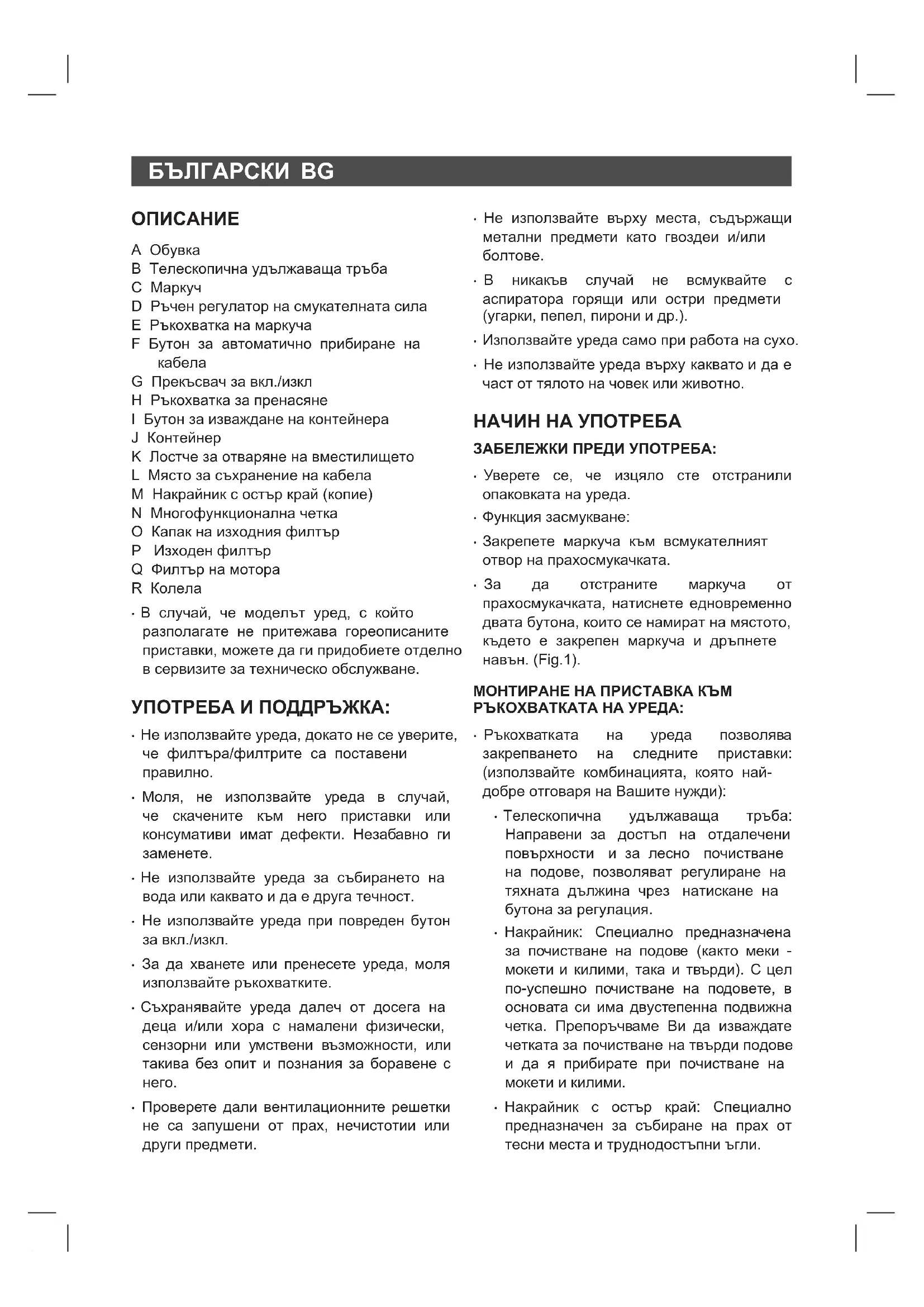 - За да отстраните маркуча от прахосмукачката, натиснете едновременно двата бутона, които се намират на мястото, където е закрепен маркуча и дръпнете навън. (Fig.1). МОНТИРАНЕ НА ПРИСТАВКА КЪМ РЪКОХВАТКАТА НА УРЕДА: