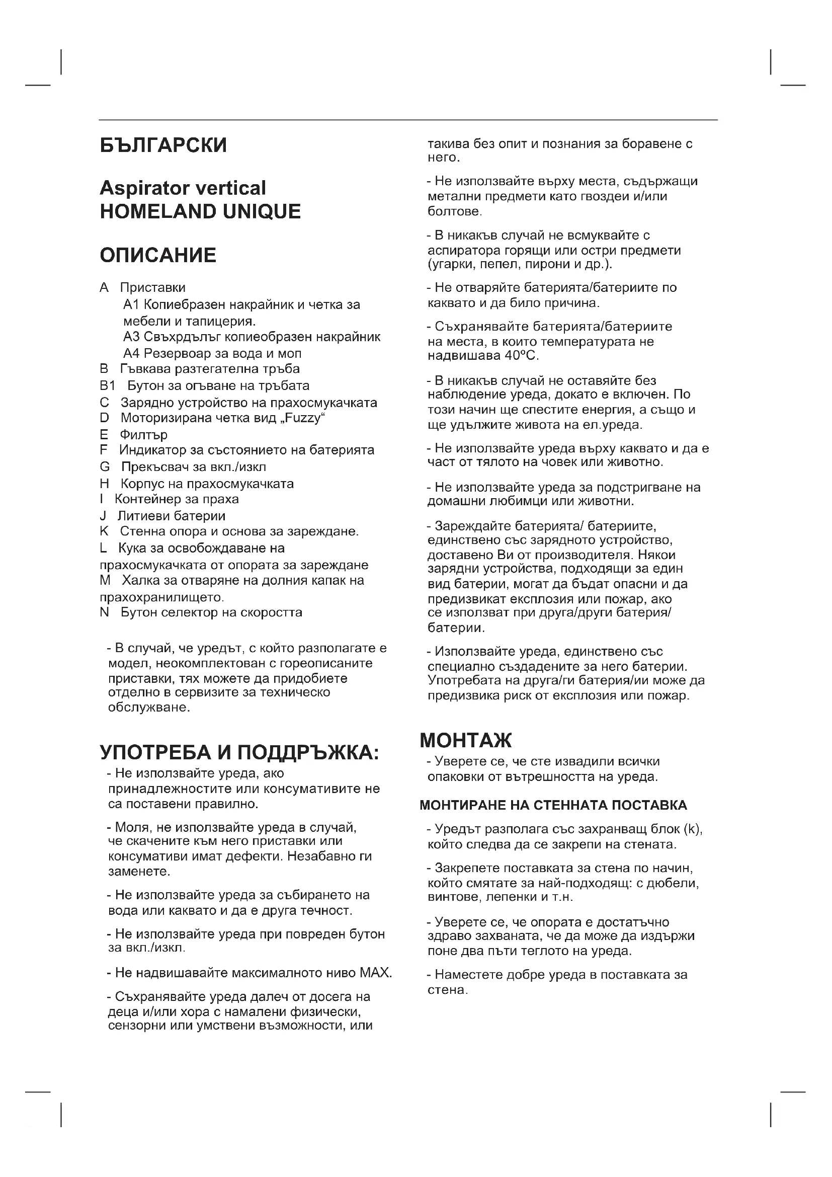 A Приставки A1 Копиебразен накрайник и четка за мебели и тапицерия. A3 Свъхрдълъг копиеобразен накрайник A4 Резервоар за вода и моп B Гъвкава разтегателна тръба B1 Бутон за огъване на тръбата C Зарядно устройство на прахосмукачката D Моторизирана четка вид „Fuzzy“ E Филтър F Индикатор за състоянието на батерията G Прекъсвач за вкл./изкл H Корпус на прахосмукачката I Контейнер за праха J Литиеви батерии K Стенна опора и основа за зареждане. L Кука за освобождаване на прахосмукачката от опората за зареждане M Халка за отваряне на долния капак на прахохранилището. N Бутон селектор на скоростта - В случай, че уредът, с който разполагате е модел, неокомплектован с гореописаните приставки, тях можете да придобиете отделно в сервизите за техническо обслужване. УПОТРЕБА И ПОДДРЪЖКА: - Не използвайте уреда, ако принадлежностите или консумативите не са поставени правилно. - Моля, не използвайте уреда в случай, че скачените към него приставки или консумативи имат дефекти. Незабавно ги