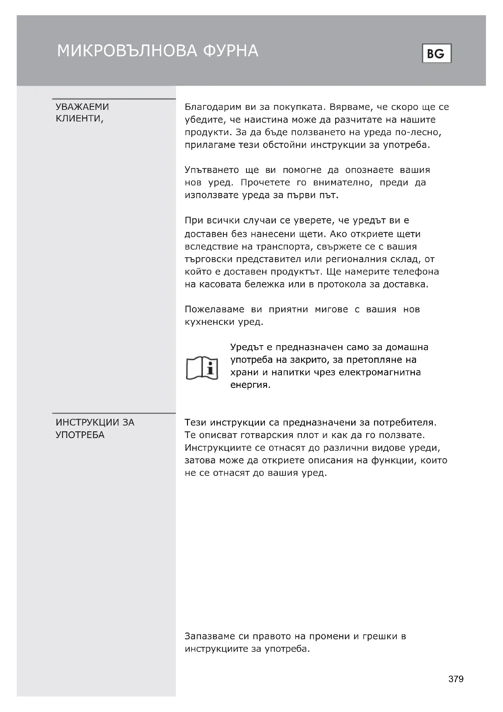 Благодарим ви за покупката. Вярваме, че скоро ще се убедите, че наистина може да разчитате на нашите продукти. За да бъде ползването на уреда по-лесно, прилагаме тези обстойни инструкции за употреба. Упътването ще ви помогне да опознаете вашия нов уред. Прочетете го внимателно, преди да използвате уреда за първи път. При всички случаи се уверете, че уредът ви е доставен без нанесени щети. Ако откриете щети вследствие на транспорта, свържете се с вашия търговски представител или регионалния склад, от който е доставен продуктът. Ще намерите телефона на касовата бележка или в протокола за доставка. Пожелаваме ви приятни мигове с вашия нов кухненски уред. Уредът е предназначен само за домашна употреба на закрито, за претопляне на храни и напитки чрез електромагнитна