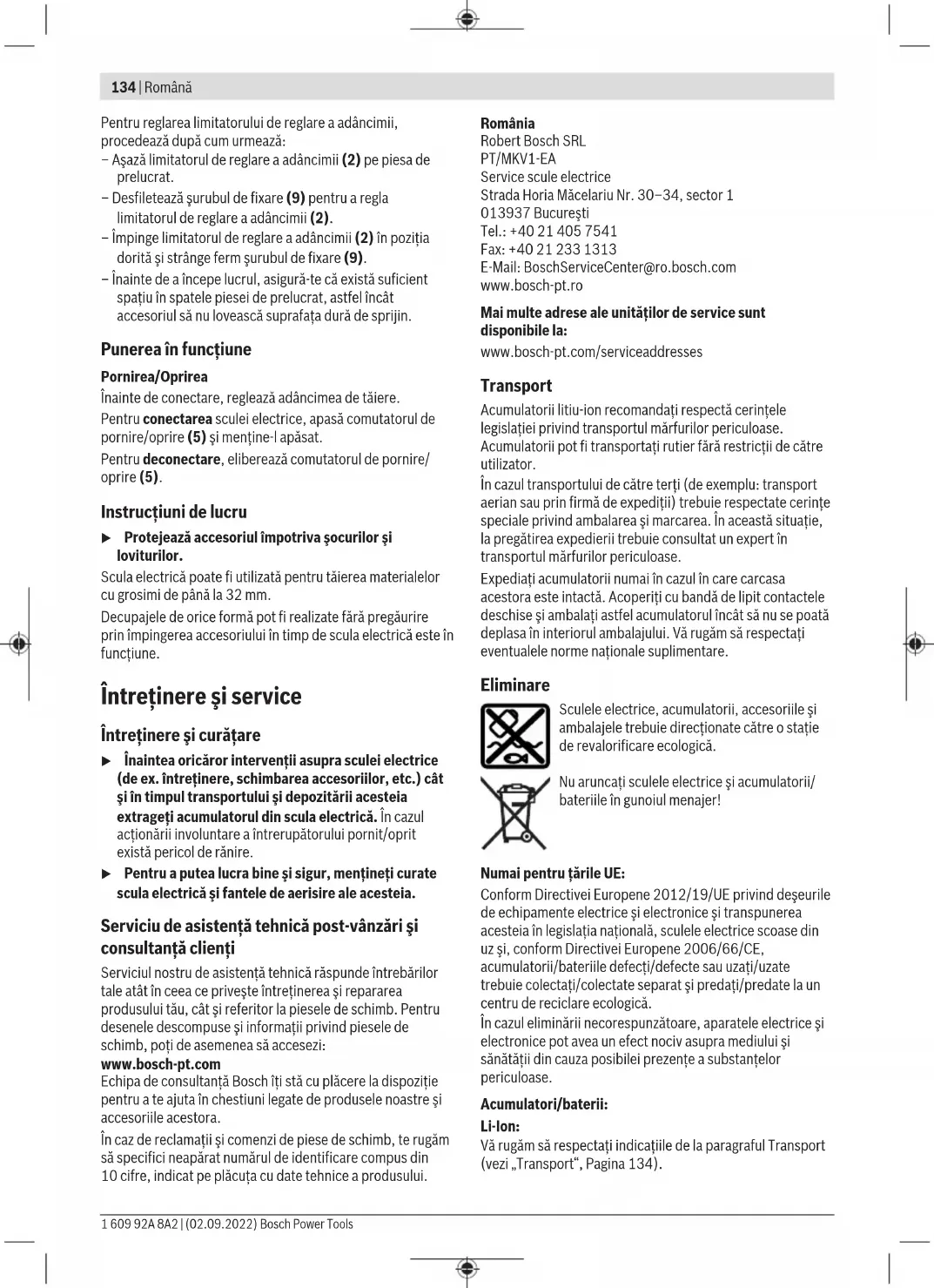 Robert Bosch SRL Service scule electrice Strada Horia Măcelariu Nr. 30–34, sector 1 013937 Bucureşti, România Тел.: +359(0)700 13 667 (Български) Факс: +40 212 331 313 Email: BoschServiceCenterBG@ro.bosch.com www.bosch-pt.com/bg/bg/ Други сервизни адреси ще откриете на: www.bosch-pt.com/serviceaddresses Транспортиране Препоръчителните литиево-йонни акумулаторни батерии трябва да изпълняват изисквания за транспортиране на опасни товари. Акумулаторните батерии могат да бъдат транспортирани от потребителя на публични места без допълнителни разрешителни. При транспортиране от трети страни (напр. при въздушен транспорт или ползване на куриерски услуги) има специ- ални изисквания към опаковането и обозначаването им. За целта при подготовката на пакетирането се консулти- райте с експерт в съответната област. Изпращайте акумулаторни батерии само ако корпусът им не е повреден. Изолирайте открити контактни клеми с ле- пящи ленти и опаковайте акумулаторните батерии така, че да не могат да се изместват в опаковката си. Моля, спазвайте също и допълнителни национални предписа-