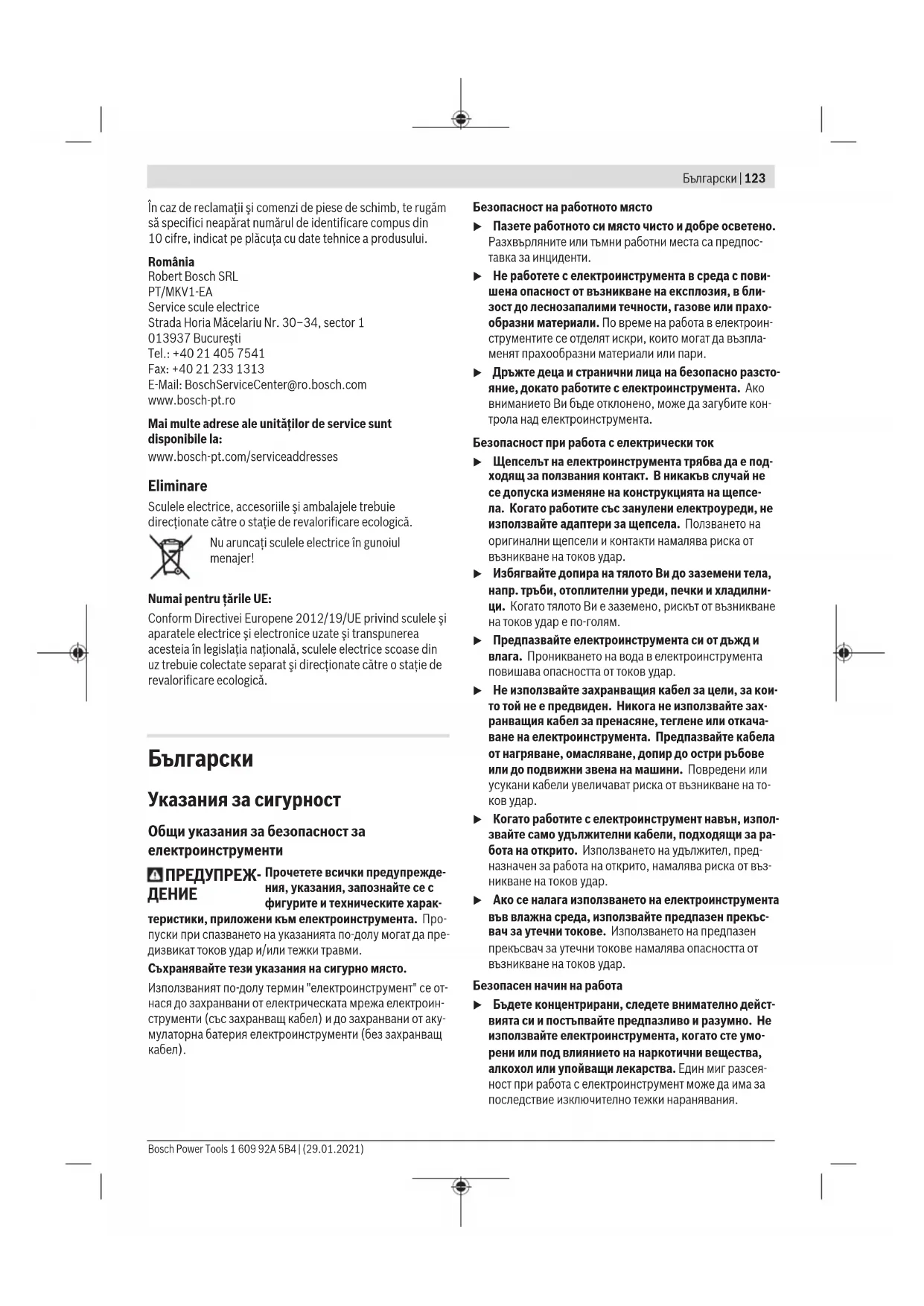 u Когато работите с електроинструмент навън, изпол- звайте само удължителни кабели, подходящи за ра- бота на открито. Използването на удължител, пред- назначен за работа на открито, намалява риска от въз- никване на токов удар. u Ако се налага използването на електроинструмента във влажна среда, използвайте предпазен прекъс- вач за утечни токове. Използването на предпазен прекъсвач за утечни токове намалява опасността от възникване на токов удар. Безопасен начин на работа u Бъдете концентрирани, следете внимателно дейст- вията си и постъпвайте предпазливо и разумно. Не използвайте електроинструмента, когато сте умо- рени или под влиянието на наркотични вещества, алкохол или упойващи лекарства. Един миг разсея- ност при работа с електроинструмент може да има за последствие изключително тежки наранявания. Bosch Power Tools 1 609 92A 5B4 | (29.01.2021)124 | Български u Работете с предпазващо работно облекло. Винаги носете предпазни очила. Носенето на подходящи за ползвания електроинструмент и извършваната дей- ност лични предпазни средства, като дихателна маска, здрави плътнозатворени обувки със стабилен грай- фер, защитна каска или шумозаглушители (антифо- ни), намалява риска от възникване на трудова злопо-