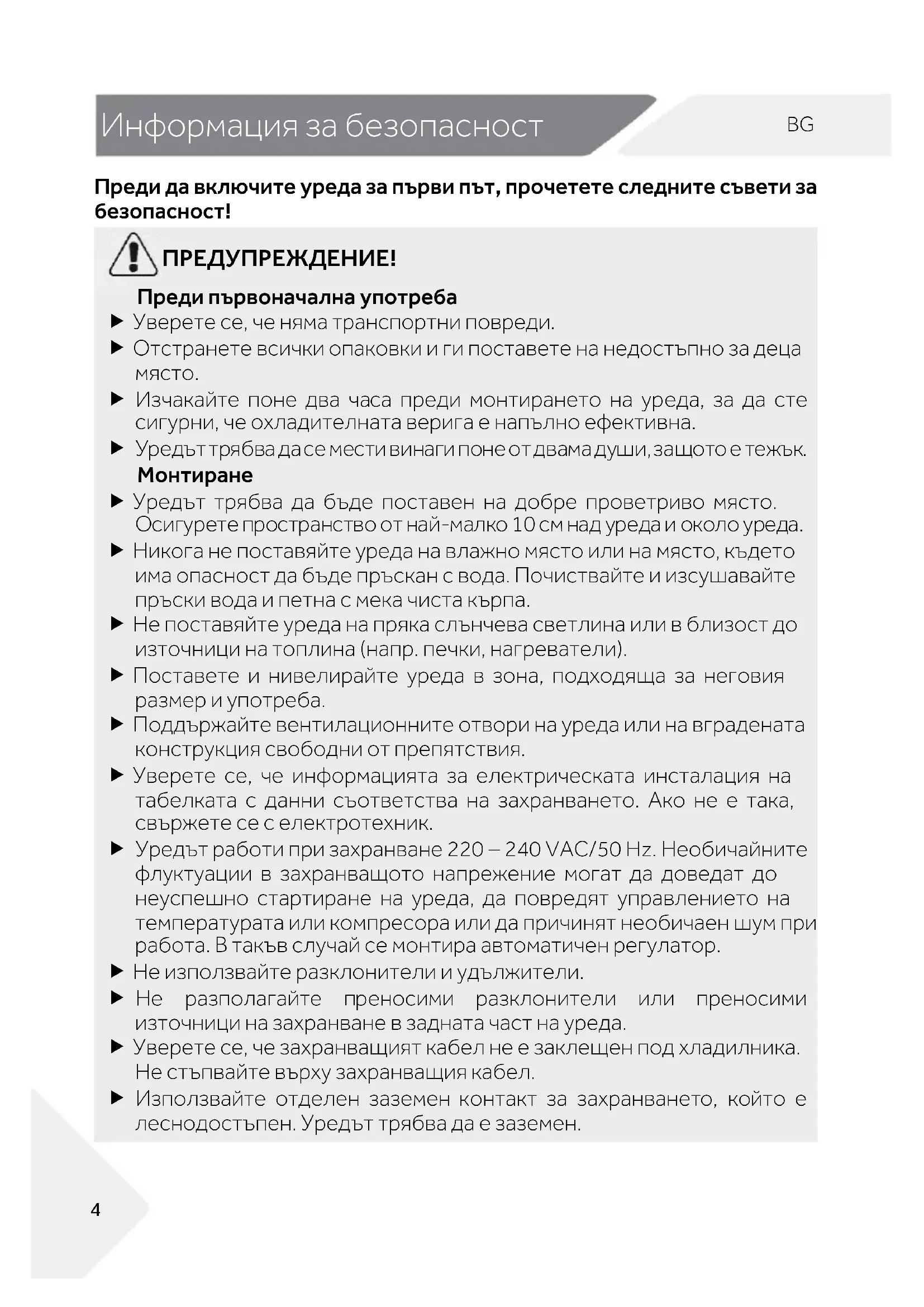 Информация за б езопасно ст Преди да включите уреда за първи път, прочетете следните съвети за безопасност! ПРЕДУПРЕЖДЕНИЕ! Преди първоначална употреба Уверете се, че няма транспортни повреди. Отстранете всички опаковки и ги поставете на недостъпно за деца