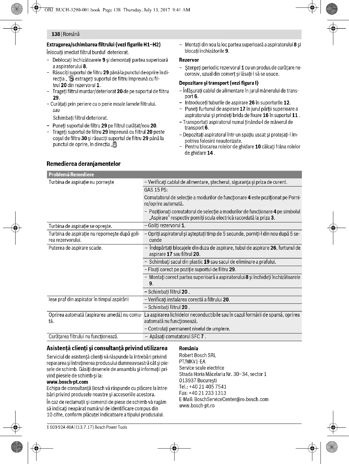 При техническо обслужване и почистване на прахо- смукачката работете с дихателна маска. Когато е необходима замяна на захранващия кабел, тя трябва да се извърши в оторизиран сервиз за електроин- струменти на Бош, за да се запази нивото на безопасност на електроинструмента. Изваждане/замяна на филтъра (вижте фигури H1– H2) Незабавно заменяйте нагънатия филтър , ако се повреди. – Отворете скобите 9 и извадете горната част на прахо- смукачката 8. – Завъртете гнездото на филтъра 29 до упор в посоката « » и извадете гнездото 20 от коша 1. – Извадете замърсения/повредения филтър 20 от стой- ката 29. –Почистете ламелите на филтъра с мека четка.