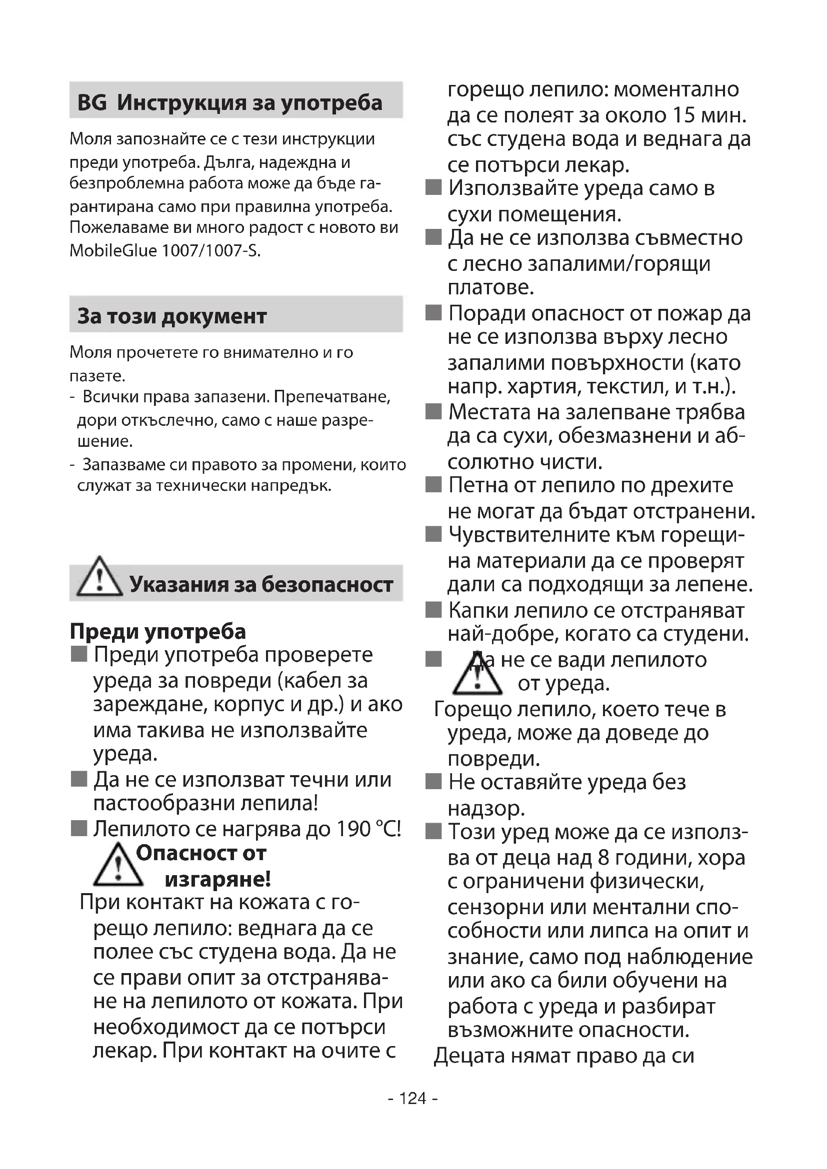 RU- 124 - BG Инструкция за употреба Моля запознайте се с тези инструкции преди употреба. Дълга, надеждна и безпроблемна работа може да бъде га- рантирана само при правилна употреба. Пожелаваме ви много радост с новото ви MobileGlue 1007/1007-S. За този документ Моля прочетете го внимателно и го
