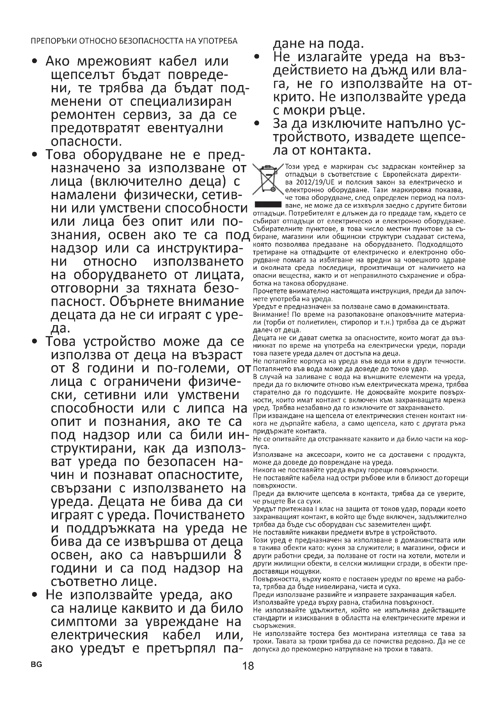 - За да изключите напълно ус- тройството, извадете щепсе- ла от контакта. Този уред е маркиран със задраскан контейнер за отпадъци в съответствие с Европейската директи- ва 2012/19/UE и полския закон за електрическо и електронно оборудване. Тази маркировка показва, че това оборудване, след определен период на полз- ване, не може да се изхвърля заедно с другите битови отпадъци. Потребителят е длъжен да го предаде там, където се събират отпадъци от електрическо и електронно оборудване. Събирателните пунктове, в това число местни пунктове за съ- биране, магазини или общински структури създават система, която позволява предаване на оборудването. Подходящото третиране на отпадъците от електрическо и електронно обо- рудване помага за избягване на вредни за човешкото здраве и околната среда последици, произтичащи от наличието на опасни вещества, както и от неправилното съхранение и обра- ботка на такова оборудване. Прочетете внимателно настоящата инструкция, преди да започ- нете употреба на уреда. Уредът е предназначен за ползване само в домакинствата. Внимание! По време на разопаковане опаковъчните материа- ли (торби от полиетилен, стиропор и т.н.) трябва да се държат далеч от деца. Децата не си дават сметка за опасностите, които могат да въз- никнат по време на употреба на електрически уреди, поради това пазете уреда далеч от достъпа на деца. Не потапяйте корпуса на уреда във вода или в други течности. Потапянето във вода може да доведе до токов удар. В случай на заливане с вода на външните елементи на уреда, преди да го включите отново към електрическата мрежа, трябва старателно да го подсушите. Не докосвайте мокрите повърх- ности, които имат контакт с включен към захранващата мрежа уред. Трябва незабавно да го изключите от захранването. При изваждане на щепсела от електрическия стенен контакт ни- кога не дърпайте кабела, а само щепсела, като с другата ръка придържате контакта. Не се опитвайте да отстранявате каквито и да било части на кор-
