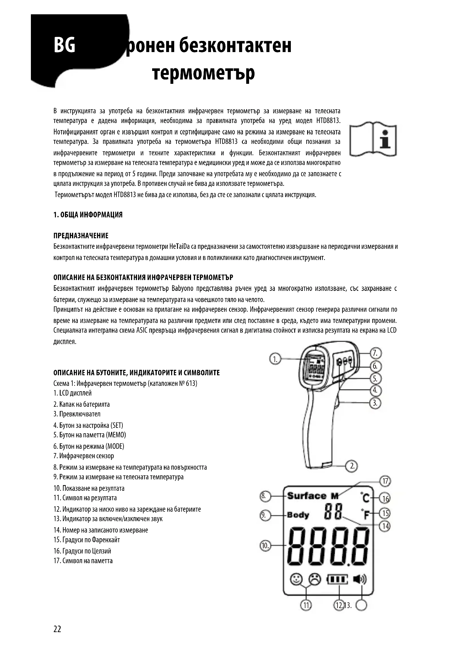 ОПИСАНИЕ НА БУТОНИТЕ, ИНДИКАТОРИТЕ И СИМВОЛИТЕ Схема 1: Инфрачервен термометър (каталожен № 613)