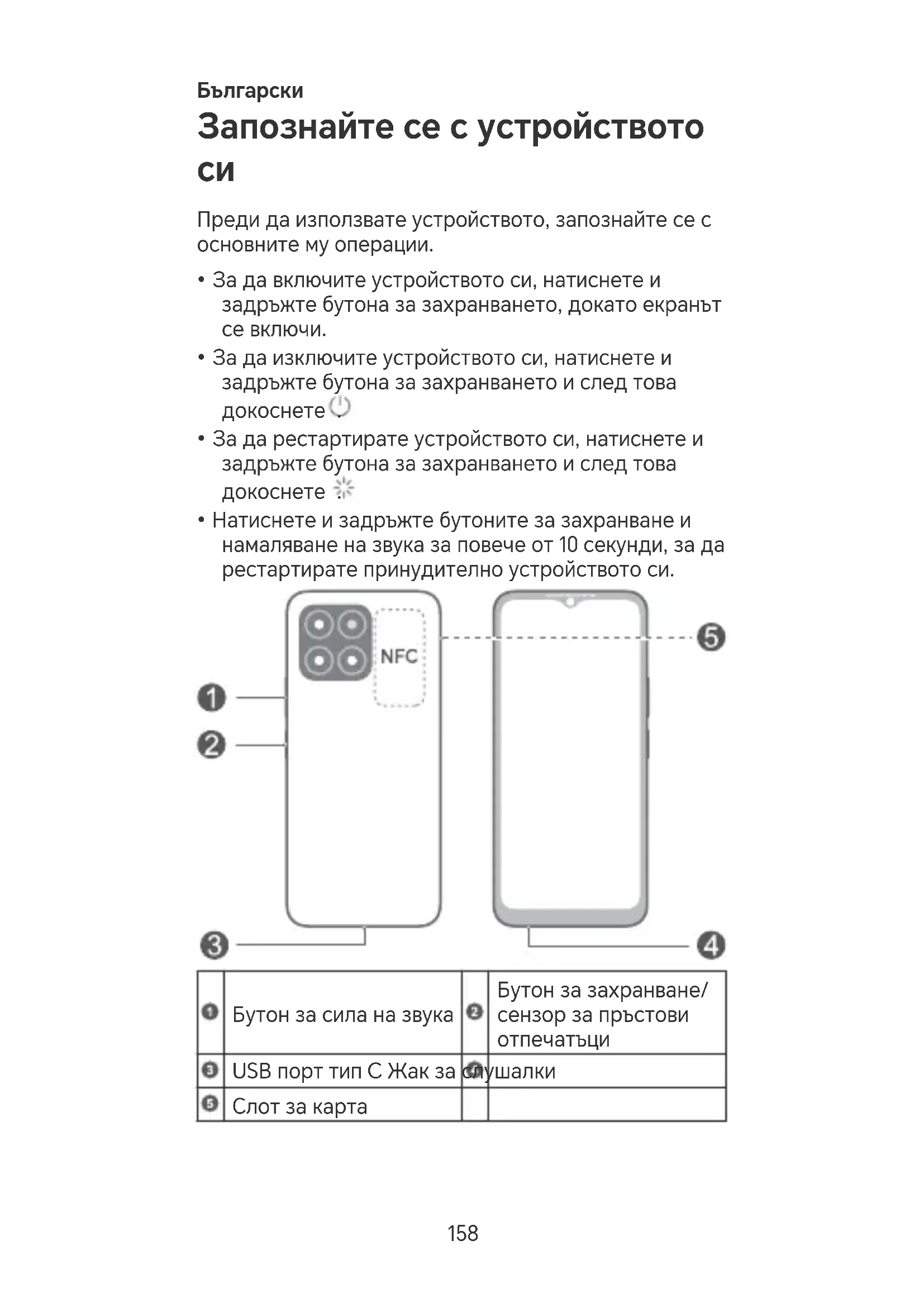 USB порт тип C Жак за слушалки Слот за карта 158• Имайте предвид, че зоната за NFC трябва да е в близост до други устройства или обекти при използване на функцията за NFC.