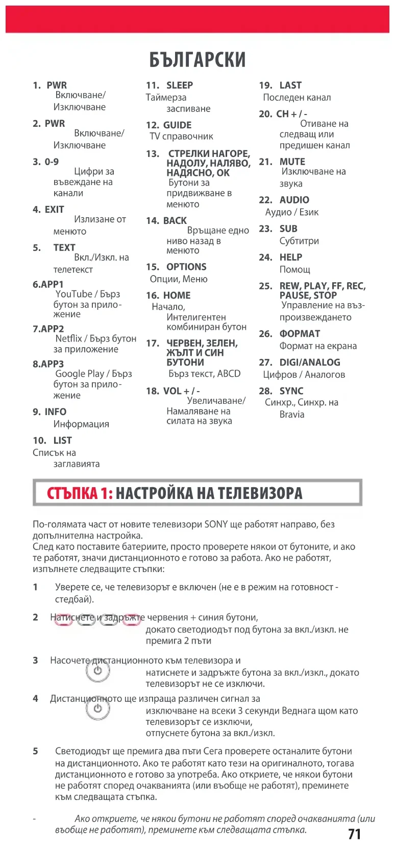 2 Натиснете и задръжте червения + синия бутони, докато светодиодът под бутона за вкл./изкл. не премига 2 пъти 3 Насочете дистанционното към телевизора и натиснете и задръжте бутона за вкл./изкл., докато телевизорът не се изключи. 4 Дистанционното ще изпраща различен сигнал за изключване на всеки 3 секунди Веднага щом като телевизорът се изключи, отпуснете бутона за вкл./изкл. 5 Светодиодът ще премига два пъти Сега проверете останалите бутони на дистанционното. Ако те работят като тези на оригиналното, тогава дистанционното е готово за употреба. Ако откриете, че някои бутони не работят според очакванията (или въобще не работят), преминете към следващата стъпка. - Ако откриете, че някои бутони не работят според очакванията (или въобще не работят), преминете към следващата стъпка. СТЪПКА 1: НАСТРОЙКА НА ТЕЛЕВИЗОРА