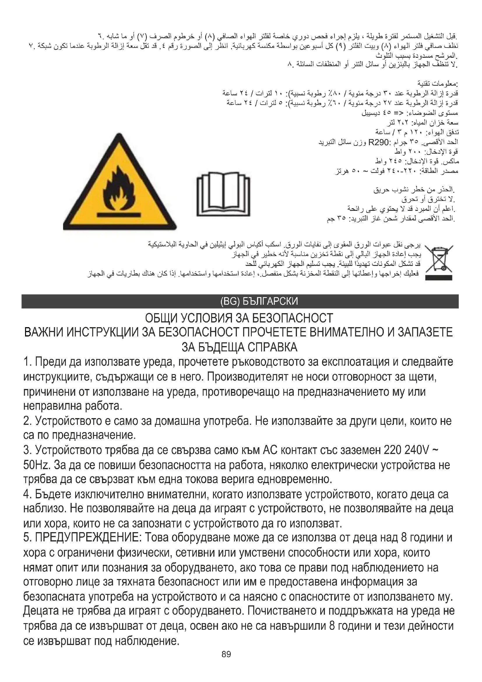 ТЕХНИЧЕСКИ ДАННИ: Капацитет за изсушаване при 30°C / 80% RH): 10 литра / 24 часа Капацитет за изсушаване при 27°C / 60% RH): 5 литра / 24 часа Ниво на шум: <= 45dB Капацитет на резервоара за вода: 2,2 литра Въздушен поток: 120 m3 / h R290 тегло на охлаждащата течност: макс. 35 грама Номинална входна мощност: 200W Макс. Номинална входна мощност: 245W Захранване: 220-240V ~50Hz Предупреждение, опасност от пожар. НЕ пробийте и не запалете Моля, имайте предвид, че хладилният агент може да е без мирис Максимално количество хладилен агент: 35 g. Моля, прехвърлете картонените опаковки в отпадъчна хартия. Изсипете полиетиленовите торбички (PE) в пластмасовия контейнер. Износеното устройство трябва да се върне в съответното място за съхранение, тъй като е опасно в устройството съставките могат да представляват заплаха за околната среда. Електрическото устройство трябва да бъде предадено докрай повторното му използване и използване. Ако в устройството има батерии, трябва да извадите и да дадете на точката, съхранявана отделно.93