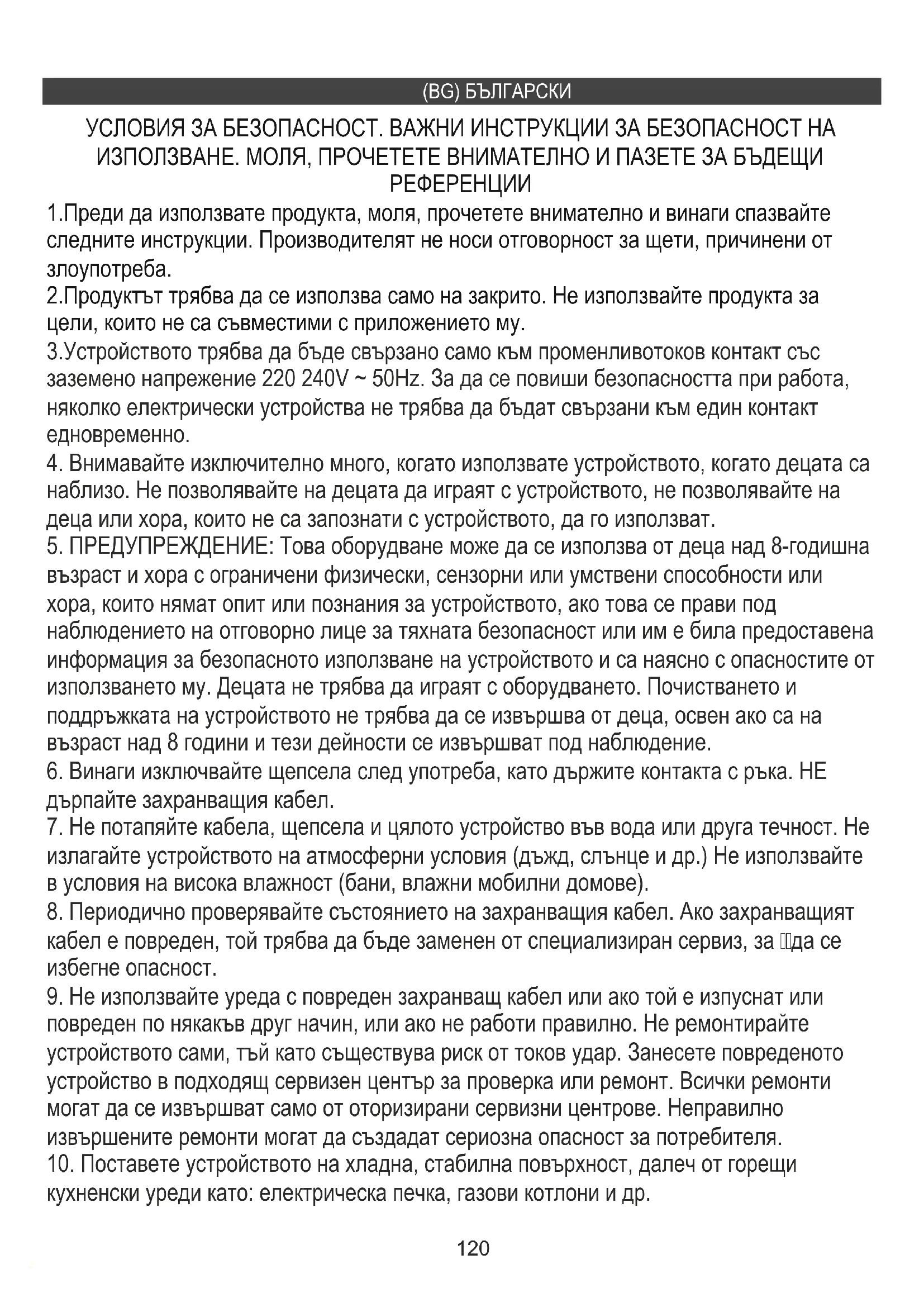 1.Преди да използвате продукта, моля, прочетете внимателно и винаги спазвайте следните инструкции. Производителят не носи отговорност за щети, причинени от злоупотреба. 2.Продуктът трябва да се използва само на закрито. Не използвайте продукта за цели, които не са съвместими с приложението му. 3.Устройството трябва да бъде свързано само към променливотоков контакт със заземенo напрежение 220 240V ~ 50Hz. За да се повиши безопасността при работа, няколко електрически устройства не трябва да бъдат свързани към един контакт едновременно.