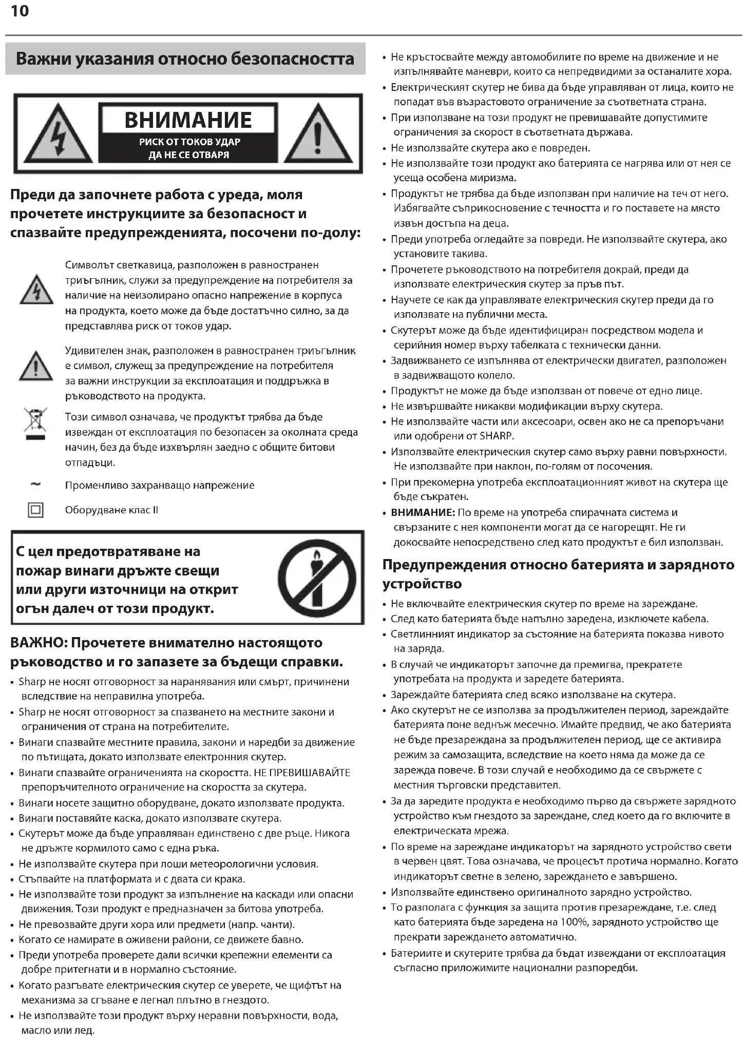 - Sharp не носят отговорност за наранявания или смърт, причинени вследствие на неправилна употреба.• Sharp не носят отговорност за спазването на местните закони и ограничения от страна на потребителите.• Винаги спазвайте местните правила, закони и наредби за движение по пътищата, докато използвате електронния скутер.• Винаги спазвайте ограниченията на скоростта. НЕ ПРЕВИШАВАЙТЕ препоръчителното ограничение на скоростта за скутера.• Винаги носете защитно оборудване, докато използвате продукта.• Винаги поставяйте каска, докато използвате скутера.• Скутерът може да бъде управляван единствено с две ръце. Никога не дръжте кормилото само с една ръка.• Не използвайте скутера при лоши метеорологични условия.• Стъпвайте на платформата и с двата си крака.• Не използвайте този продукт за изпълнение на каскади или опасни движения. Този продукт е предназначен за битова употреба.• Не превозвайте други хора или предмети (напр. чанти).• Когато се намирате в оживени райони, се движете бавно.• Преди употреба проверете дали всички крепежни елементи са добре притегнати и в нормално състояние.• Когато разгъвате електрическия скутер се уверете, че щифтът на механизма за сгъване е легнал плътно в гнездото.• Не използвайте този продукт върху неравни повърхности, вода, масло или лед.• Не кръстосвайте между автомобилите по време на движение и не изпълнявайте маневри, които са непредвидими за останалите хора.• Електрическият скутер не бива да бъде управляван от лица, които не попадат във възрастовото ограничение за съответната страна.• При използване на този продукт не превишавайте допустимите ограничения за скорост в съответната държава.• Не използвайте скутера ако е повреден.• Не използвайте този продукт ако батерията се нагрява или от нея се усеща особена миризма.• Продуктът не трябва да бъде използван при наличие на теч от него. Избягвайте съприкосновение с течността и го поставете на място извън достъпа на деца.• Преди употреба огледайте за повреди. Не използвайте скутера, ако установите такива.• Прочетете ръководството на потребителя докрай, преди да използвате електрическия скутер за пръв път.• Научете се как да управлявате електрическия скутер преди да го използвате на публични места.• Скутерът може да бъде идентифициран посредством модела и серийния номер върху табелката с технически данни.• Задвижването се изпълнява от електрически двигател, разположен взадвижващото колело.• Продуктът не може да бъде използван от повече от едно лице.• Не извършвайте никакви модификации върху скутера.• Не използвайте части или аксесоари, освен ако не са препоръчани или одобрени от SHARP.• Използвайте електрическия скутер само върху равни повърхности. Не използвайте при наклон, по-голям от посочения.• При прекомерна употреба експлоатационният живот на скутера ще бъде съкратен.• ВНИМАНИЕ: По време на употреба спирачната система и свързаните с нея компоненти могат да се нагорещят. Не ги докосвайте непосредствено след като продуктът е бил използван. Предупреждения относно батерията и зарядното