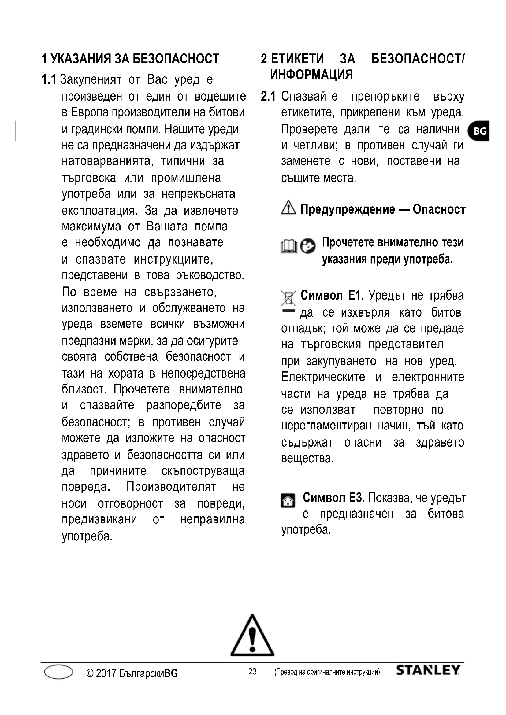 Символ E3. Показва, че уредът е предназначен за битова употреба.24 (Превод на оригиналните инструкции) © 2017 Български (Превод на оригиналните инструкции) © 2017 БългарскиBG