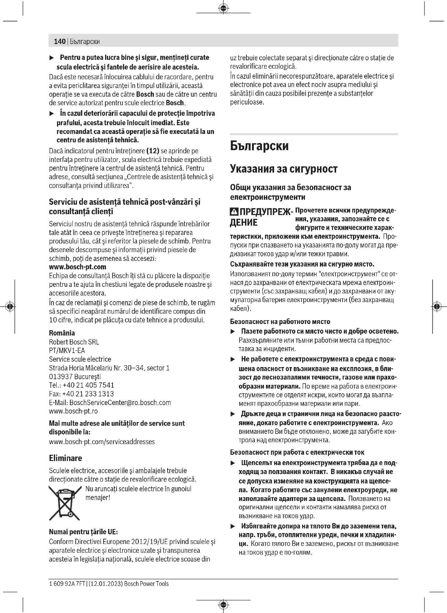 u Преди да извършвате каквито и да е дейности по електроинструмента, напр. настройване, смяна на работен инструмент, както и когато го прибирате, изключвайте щепсела от контакта, респ. изваждай- те батерията, ако е възможно. Тази мярка премахва опасността от задействане на електроинструмента по невнимание. u Съхранявайте електроинструментите на места, къ- дето не могат да бъдат достигнати от деца. Не до- пускайте те да бъдат използвани от лица, които не са запознати с начина на работа с тях и не са проче- ли тези инструкции. Когато са в ръцете на неопитни потребители, електроинструментите могат да бъдат из- ключително опасни. u Поддържайте добре електроинструментите си и ак- сесоарите им. Проверявайте дали подвижните зве- на функционират безукорно, дали не заклинват, да- ли има счупени или повредени детайли, които нару- шават или изменят функциите на електроинстру- мента. Преди да използвате електроинструмента, се погрижете повредените детайли да бъдат ремон- тирани. Много от трудовите злополуки се дължат на недобре поддържани електроинструменти и уреди. u Поддържайте режещите инструменти винаги добре заточени и чисти. Добре поддържаните режещи инст- рументи с остри ръбове оказват по‑малко съпротивле- ние и се водят по‑леко. Bosch Power Tools 1 609 92A 7FT | (12.01.2023)142 | Български u Използвайте електроинструментите, допълнител- ните приспособления, работните инструменти и т. н., съобразно инструкциите на производителя. При това се съобразявайте и с конкретните работни ус- ловия и операции, които трябва да изпълните. Из- ползването на електроинструменти за различни от предвидените от производителя приложения повиша- ва опасността от възникване на трудови злополуки. u Поддържайте дръжките и ръкохватките сухи, чисти и неомаслени. Хлъзгавите дръжки и ръкохватки не позволяват безопасната работа и доброто контролира- не на електроинструмента при възникване на неочак- вана ситуация.