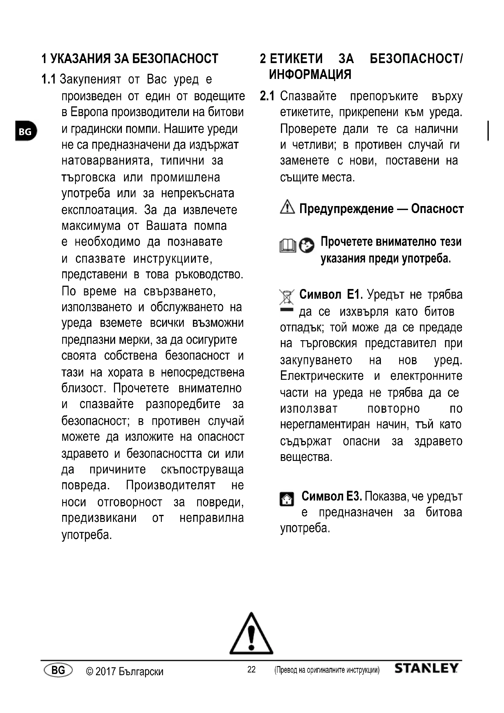 Символ E3. Показва, че уредът е предназначен за битова употреба.23 (Превод на оригиналните инструкции) © 2017 Български (Превод на оригиналните инструкции) © 2017 Български