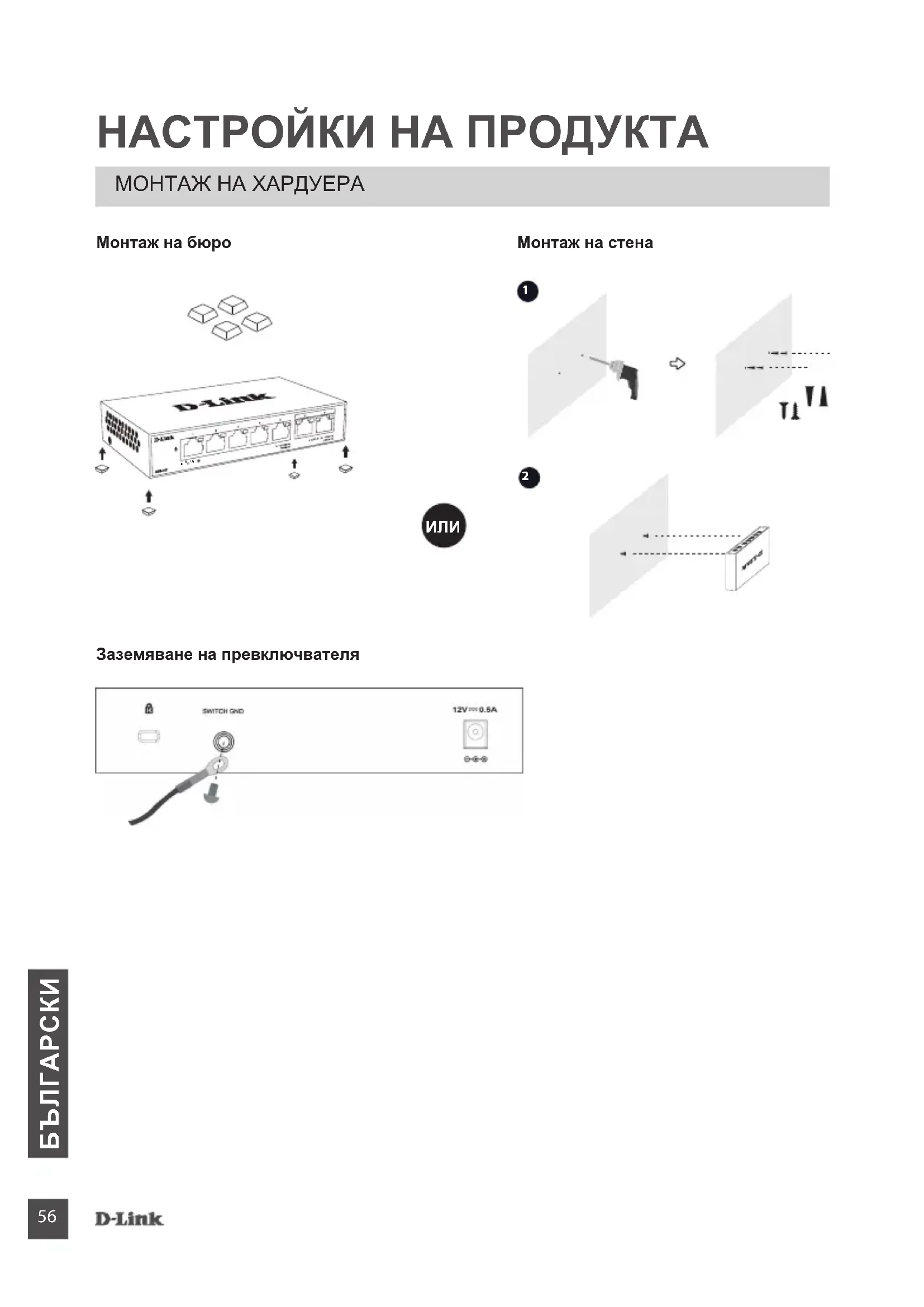 НАСТРОЙКИ НА ПРОДУКТА МОНТАЖ НА ХАРДУЕРA Монтаж на бюро Заземяване на превключвателя Монтаж на стена