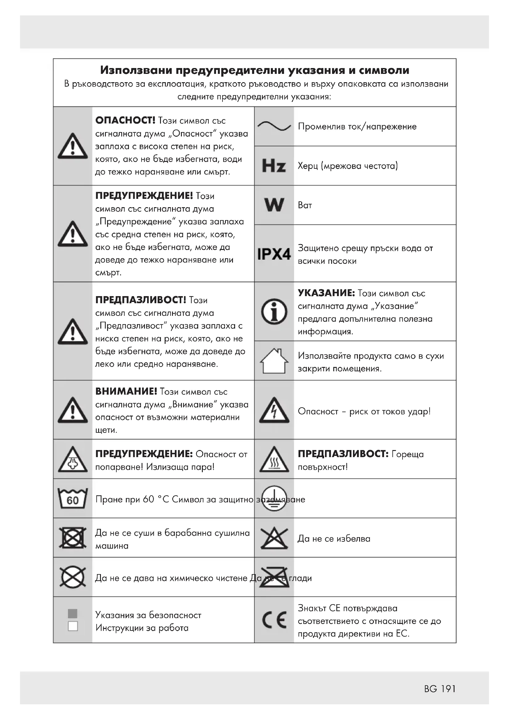 Да не се избелва Да не се дава на химическо чистене Да не се глади Указания за безопасност Инструкции за работа Знакът CE потвърждава съответствието с отнасящите се до продукта директиви на ЕС.192