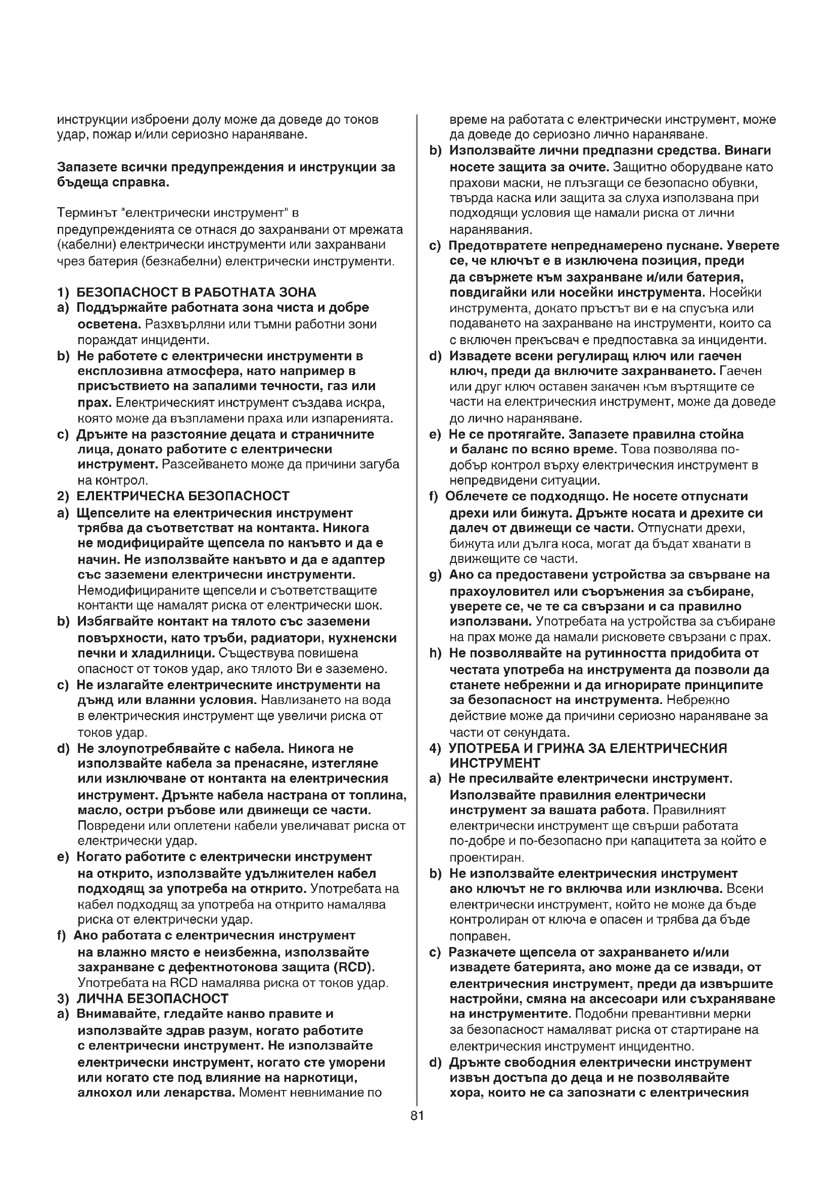 c) Разкачете щепсела от захранването и/или извадете батерията, ако може да се извади, от електрическия инструмент, преди да извършите настройки, смяна на аксесоари или съхраняване на инструментите. Подобни превантивни мерки за безопасност намаляват риска от стартиране на електрическия инструмент инцидентно. d) Дръжте свободния електрически инструмент извън достъпа до деца и не позволявайте хора, които не са запознати с електрическия инструкции изброени долу може да доведе до токов удар, пожар и/или сериозно нараняване. Запазете всички предупреждения и инструкции за бъдеща справка. Терминът "електрически инструмент" в предупрежденията се отнася до захранвани от мрежата (кабелни) електрически инструменти или захранвани чрез батерия (безкабелни) електрически инструменти.