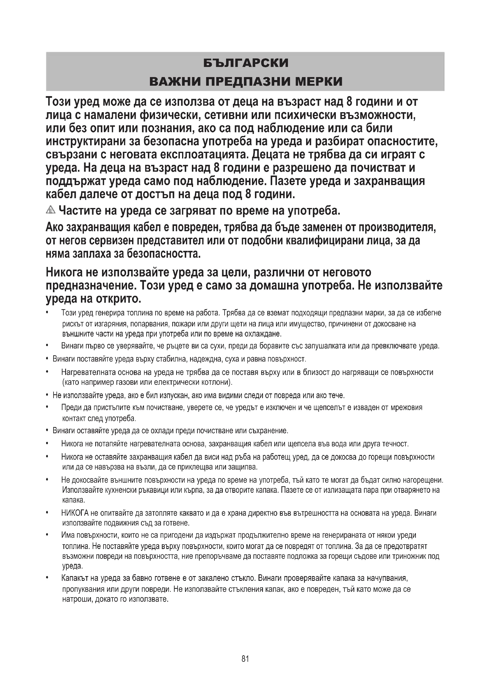 ВАЖНИ ПРЕДПАЗНИ МЕРКИ Този уред може да се използва от деца на възраст над 8 години и от лица с намалени физически, сетивни или психически възможности, или без опит или познания, ако са под наблюдение или са били инструктирани за безопасна употреба на уреда и разбират опасностите, свързани с неговата експлоатацията. Децата не трябва да си играят с уреда. На деца на възраст над 8 години е разрешено да почистват и поддържат уреда само под наблюдение. Пазете уреда и захранващия кабел далече от достъп на деца под 8 години. Частите на уреда се загряват по време на употреба. Ако захранващия кабел е повреден, трябва да бъде заменен от производителя, от негов сервизен представител или от подобни квалифицирани лица, за да няма заплаха за безопасността. Никога не използвайте уреда за цели, различни от неговото предназначение. Този уред е само за домашна употреба. Не използвайте уреда на открито.