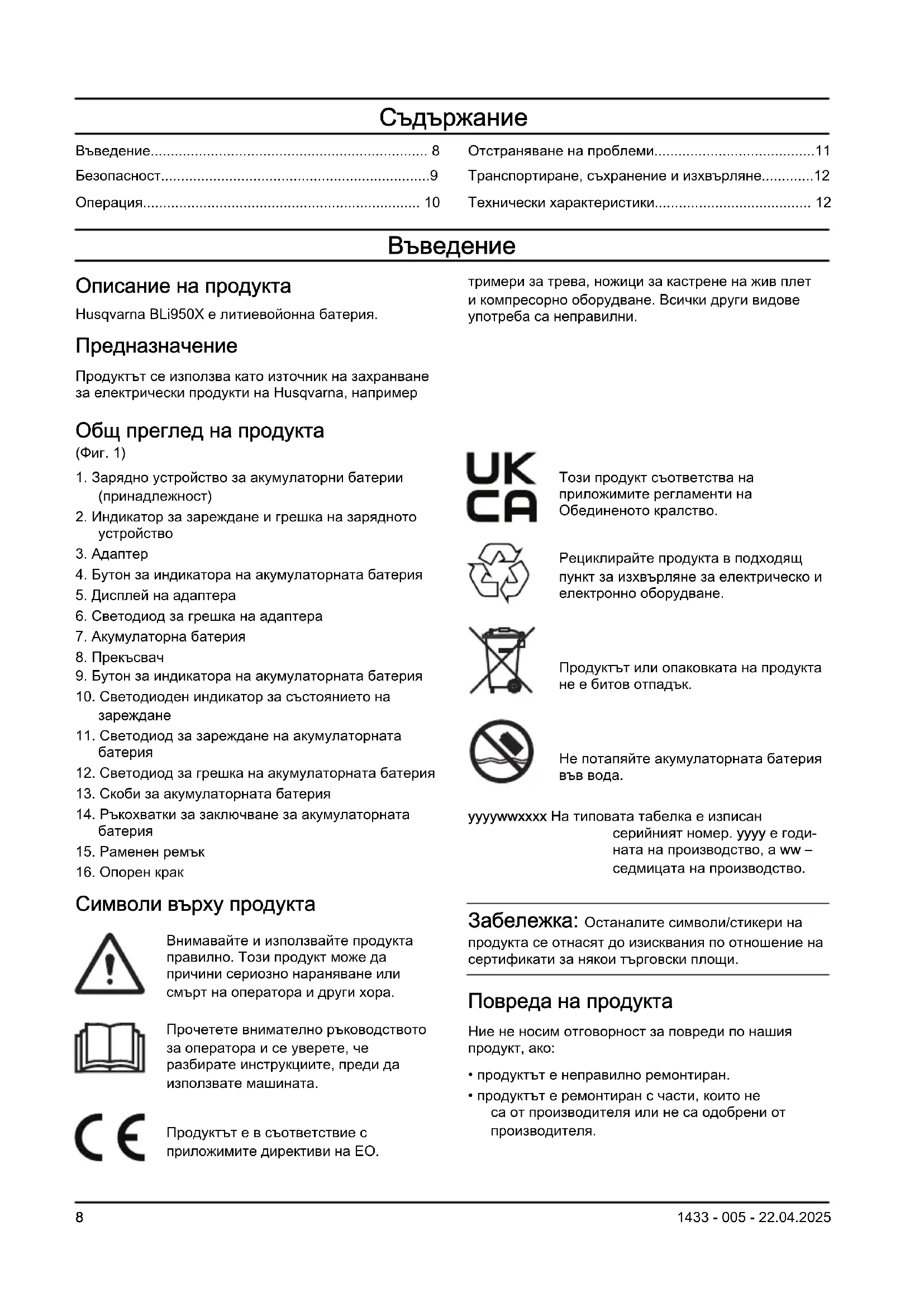 Символи върху продукта Внимавайте и използвайте продукта правилно. Този продукт може да причини сериозно нараняване или смърт на оператора и други хора. Прочетете внимателно ръководството за оператора и се уверете, че разбирате инструкциите, преди да използвате машината. Продуктът е в съответствие с приложимите директиви на ЕО. Този продукт съответства на приложимите регламенти на Обединеното кралство. Рециклирайте продукта в подходящ пункт за изхвърляне за електрическо и електронно оборудване. Продуктът или опаковката на продукта не е битов отпадък. Не потапяйте акумулаторната батерия