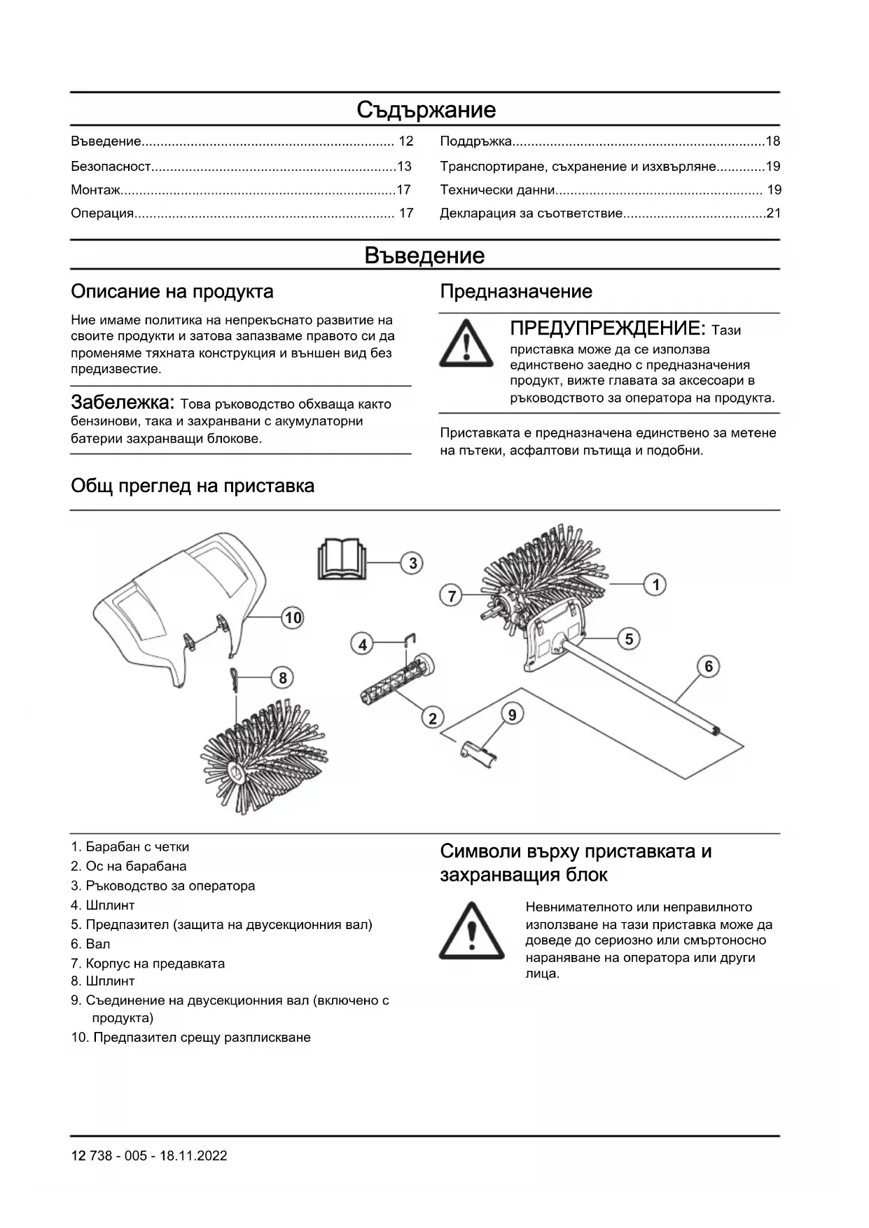 12 738 - 005 - 18.11.2022Прочетете внимателно ръковод- ството за оператора и се уверете, че разбирате инструкциите, преди да използвате приставката. Използвайте одобрена защита на слуха. Използвайте одобрени защитни средства за очите. Използвайте предпазната маска, когато има опасност от прах. Тази приставка отговаря на изискванията на приложимите директиви на EO. Този продукт съответства на приложимите регламенти на Обединеното кралство. Въртящи се части. Осигурете пространство около ръцете и краката си. Стрелката показва посоката на